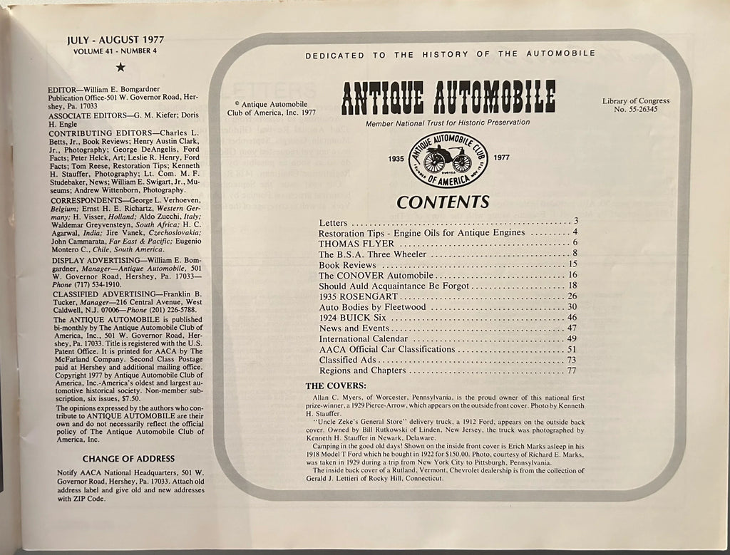 Experience the world of vintage automobiles with Antique Automobile Magazine's July/August 1977 issue. Discover the ideal engine oil for antique cars, learn about iconic models such as the Thomas Flyer and the Conover, and admire the craftsmanship of the Beam Bottle and BSA Three Wheeler. Explore the history and elegance of the 1935 Rosengart and the superior auto bodies by Fleetwood. Plus, don't miss out on book reviews, helpful restoration tips, and updates on club events. Join us in celebrating the timeless beauty of these classic automobiles.