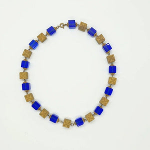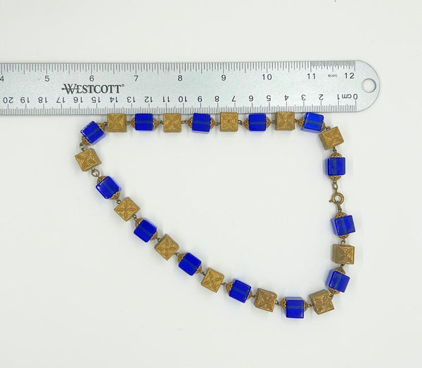 This is a beautiful antique necklace-choker made of square, embossed brass beads with deep cobalt blue square beads. The blue beads have to be seen in the light to be truly appreciated. The necklace measures approximately 17 inches long.