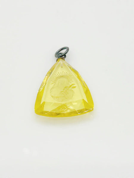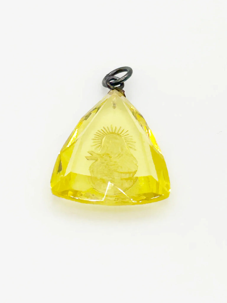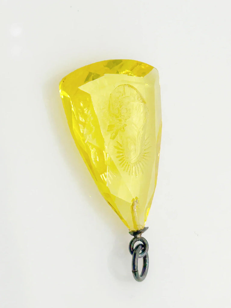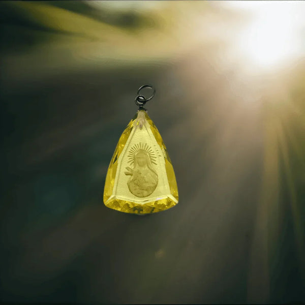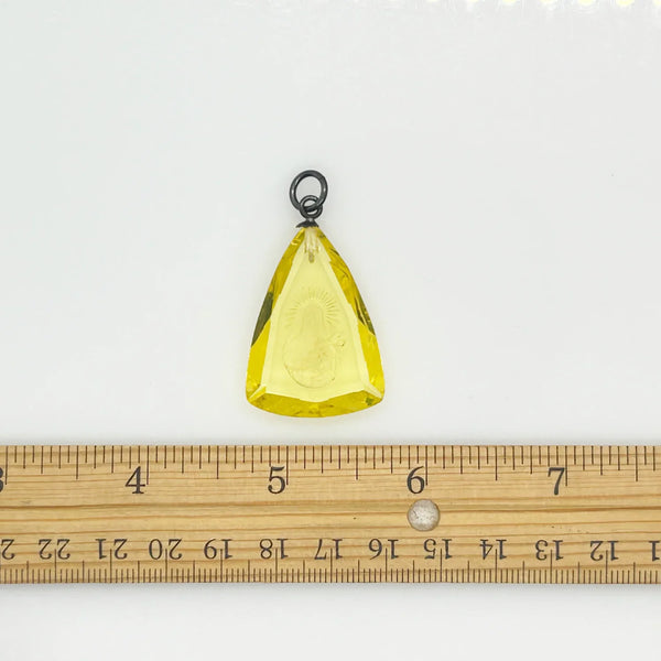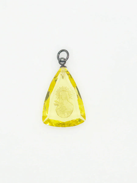 This sparkling, bright lemon colored Art Deco pendant features an intaglio of the Madonna and is in excellent condition. Wear a unique piece of art that captures the essence of vintage glamour and elegance. This stunning 2" pendant showcases a sunshine bright  Art Deco design with an intricate intaglio of the Madonna, adding a touch of divine inspiration to any outfit. Crafted in excellent condition, with  a detailed, scalloped silver-tone frame, the pendant is a testament to the craftsmanship of yesteryear, making it a true collector's item for those who appreciate beauty and sophistication. The glass is cut exquisitely and reflects the light so beautifully.