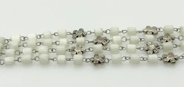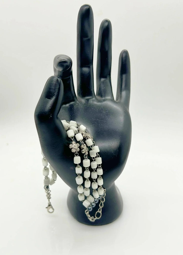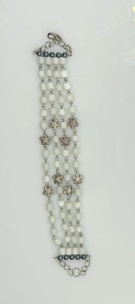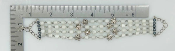 Transform your style with the stunning shimmer of this versatile four-strand bracelet showcasing brilliant white beads reminiscent of the glistening glow of selenite. The cylindrical beads are beautifully interspersed with silver tone flower beads, creating a unique and enchanting design. Each row ends in a bar of tiny faux pearl beads. Despite repeated attempts I could not get the sheen of the stones to show properly. This bracelet fits wrists around 6 1/2" and is in excellent condition, making it a must-have for any jewelry collection.