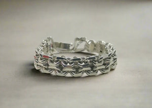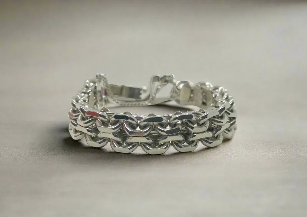 This intricately crafted silver tone link bracelet boasts oval links that are intertwined with others set in a vertical orientation for an eye-catching design, and the reverse side features sharp oval brushed and smooth panels, which provides the bracelet with extra weight and stability. The bracelet has a fold-over clasp and a safety chain and measures 6.5 inches in length and 0.5 inch in width, this piece is in excellent condition aside from some wear on the clasp .