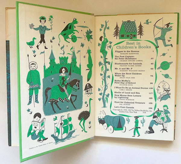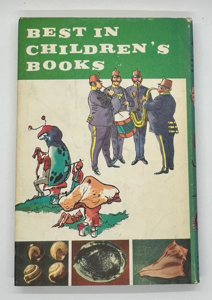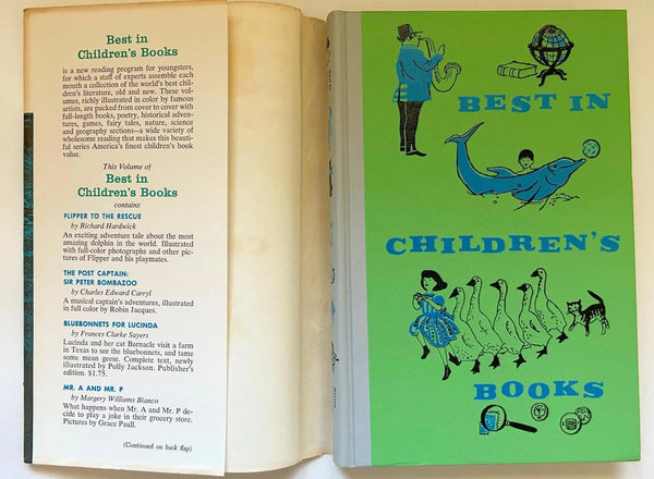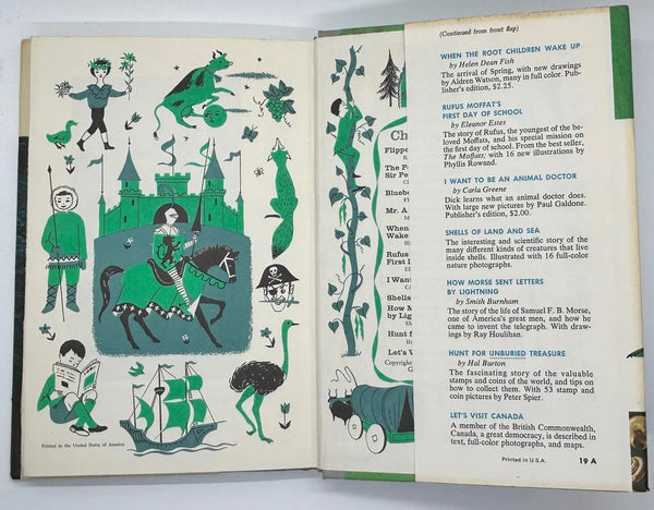 Flipper to the Rescue by Richard Hardwick; Post Captain: Sir Peter Bombazoo by Charles Edward Carryl, illustrated by Robin Jacques; Bluebonnets for Lucinda by Frances Clark Sayers, illustrated by Polly Jackson; Mr. A and Mr. P. by Margery Williams Bianco, illustrated by Grace Paull; When the Root Children Wake Up by Helen Dean Fish, illustrated by Aldren A. Watson; Rufus Moffat’s First Day of School by Eleanor Estes, illustrated by Phyllis Rowand; I Want To Be an Animal Doctor by Carla Greene, illustrated by Paul Galdone; Shells of Land and Sea illustrated with photos; How Morse Sent Letters by Lightning by Smith Burnham, illustrated by Ray Houlihan; Hunt for Unburied Treasure by Hal Burton, illustrated by Peter Spier, and Let’s Visit Canada, illustrated with photos.
