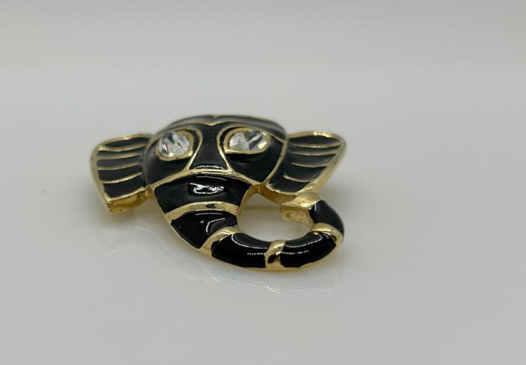 Here's a head turner of a brooch, crafted in the shape of an elephant's face and done up with black and gold enamel and blingy marquise rhinestone eyes. It's got a texture-rich back and spans 1.75" of fabulousness! Get ready to turn heads with this whimsical brooch! Expertly crafted in the shape of an elephant's face, it features striking black and gold enamel and dazzling marquise rhinestone eyes. Hurry up and snag this piece before it's gone!