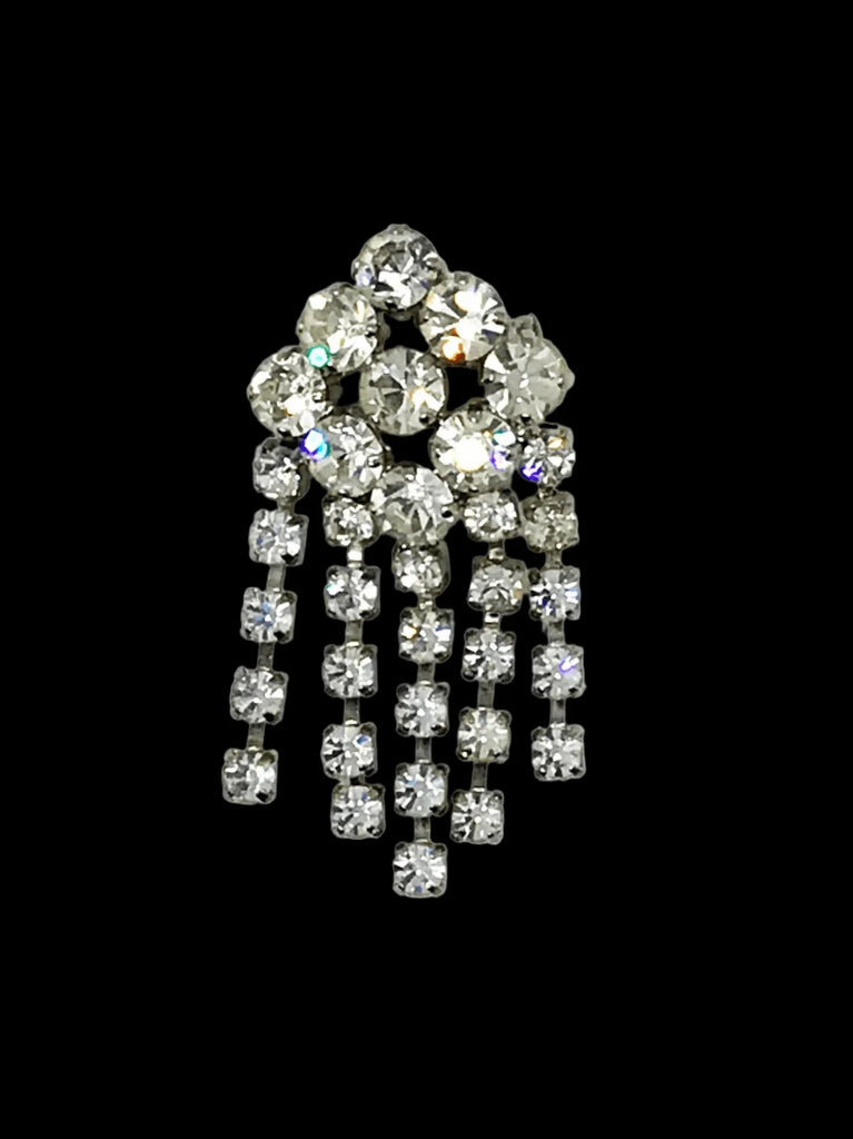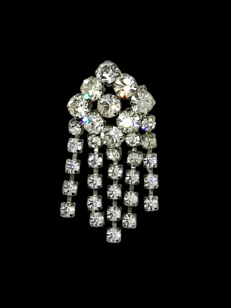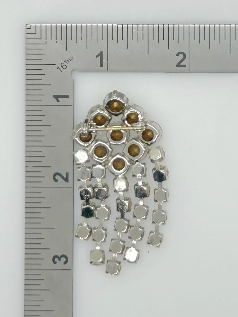 This exquisite brooch features a stunning waterfall design, showcasing a diamond-shaped base and five strands of dazzling rhinestones. The intricate design and sparkling rhinestones will add a touch of glamour to any outfit, while the durable silver tone metal ensures long-lasting use. Measuring 2.5" in length and 1" in width, this brooch is the perfect size for making a statement. In impeccable condition, it's a timeless piece that will elevate any wardrobe.