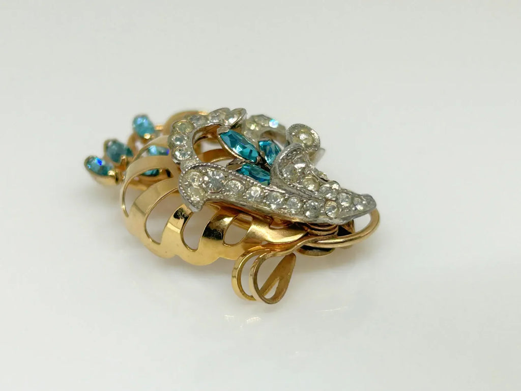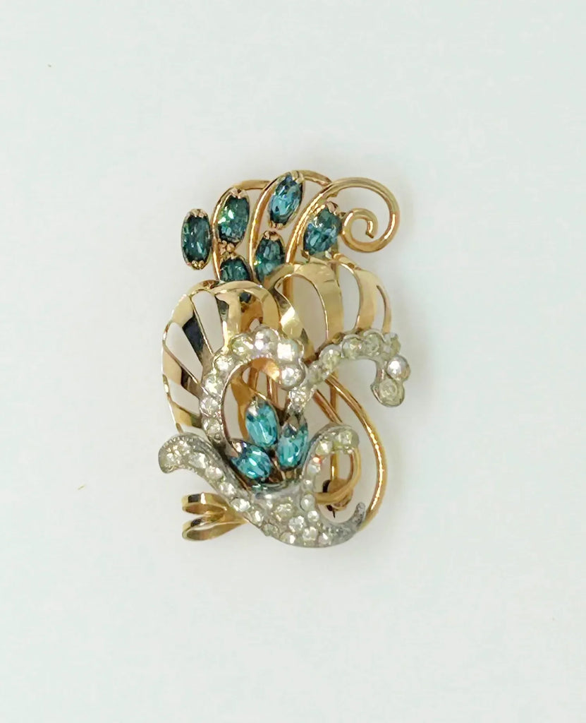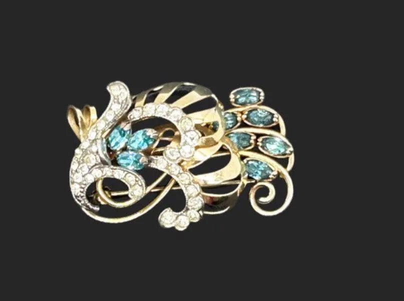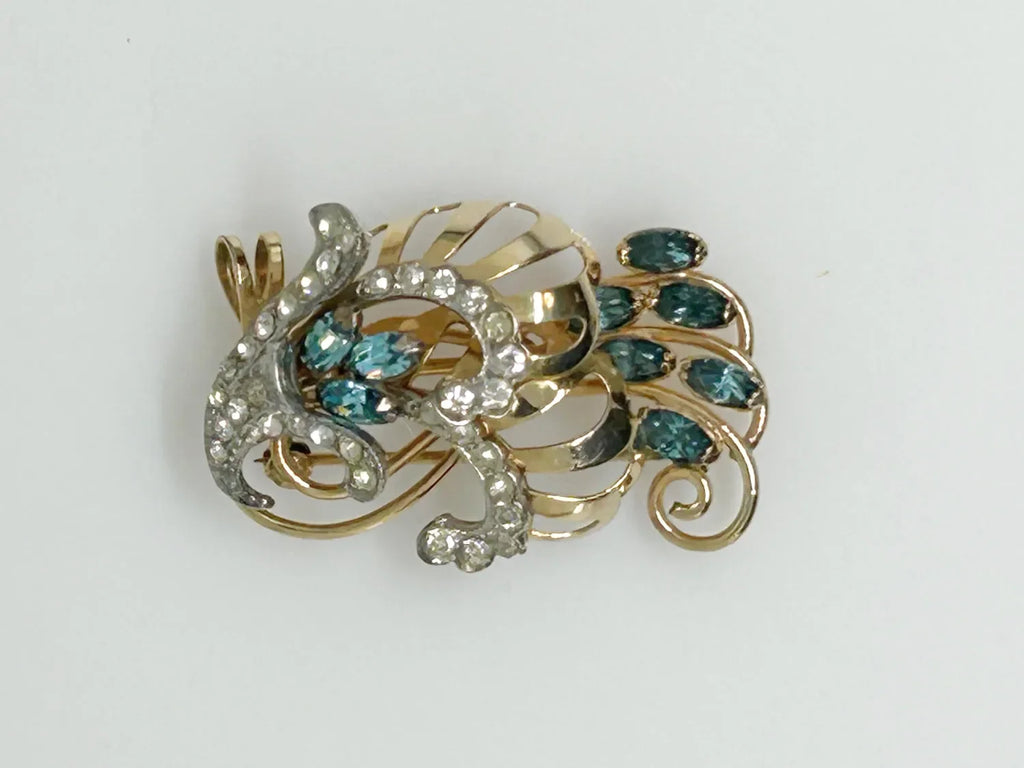 This is an exquisite Charles Reis Vintage 12k Gold Filled Brooch Pin, It has round clear stones and marquise shaped light blue stones. Bring a touch of elegance to any outfit with this Charles Reis Vintage Brooch Pin. Its intricate design, featuring round clear stones and marquise shaped light blue stones, exudes luxury and sophistication. It can also be worn as a pendant, adding to its versatility. This brooch is a statement piece that will elevate any look. Add a touch of timeless beauty to your wardrobe and make a statement with this one-of-a-kind brooch pin / pendant.