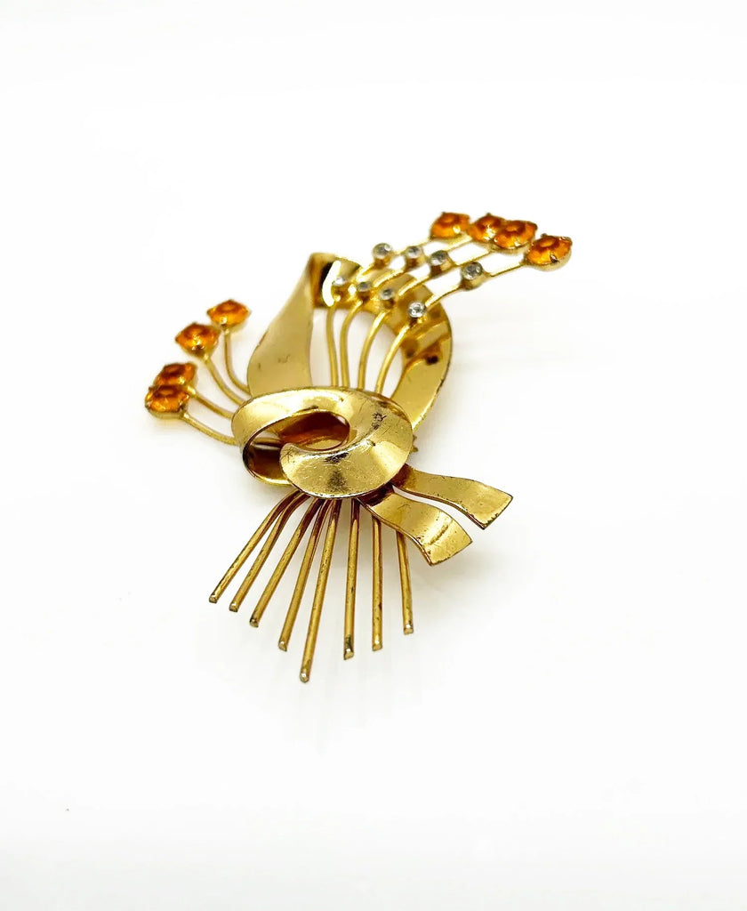 This is a massive Coro Sterling Floral Spray & Ribbon Design brooch. Get mesmerized by the splendor of this vintage brooch, measuring just under 4 inches. The bouquet, intricately designed with a bow, boasts of four gold-toned lines adorned with round, citrine-orange stones of varying sizes. The arrangement of the stones creates a square effect, while the stylish bow adds the perfect finishing touch. With the marks of Coro in elegant script and Sterling in bold capitals, this brooch is a captivating addition to any collection, and measures 3.75" tall by 2.5" wide! See for yourself, this brooch is truly a thing of beauty. Free Shipping