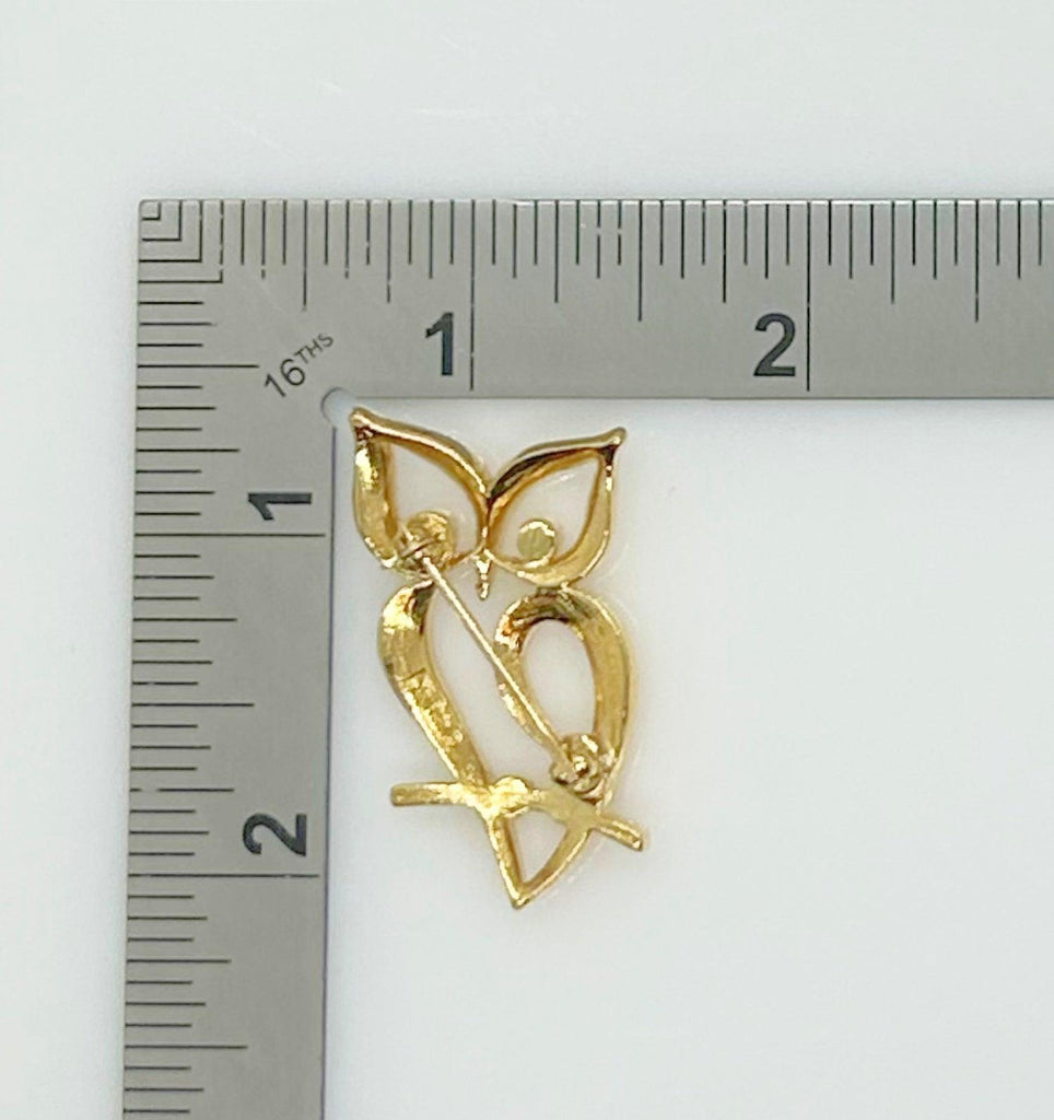 Indulge in the timeless sophistication of this stunning brooch featuring a stylized owl perched on a delicate branch. At 1.5” tall, it is adorned with the iconic Trifari crown. This exquisite piece is crafted to perfection, adding a touch of subtle elegance to any outfit. Embrace the refined and classic aesthetic of this exquisite brooch, showcasing a graceful owl resting on a dainty branch. With a height of 1.5 inches, it is embellished with the iconic Trifari crown on the reverse. Skillfully crafted to perfection, it will effortlessly elevate any ensemble with a subtle yet sophisticated touch.