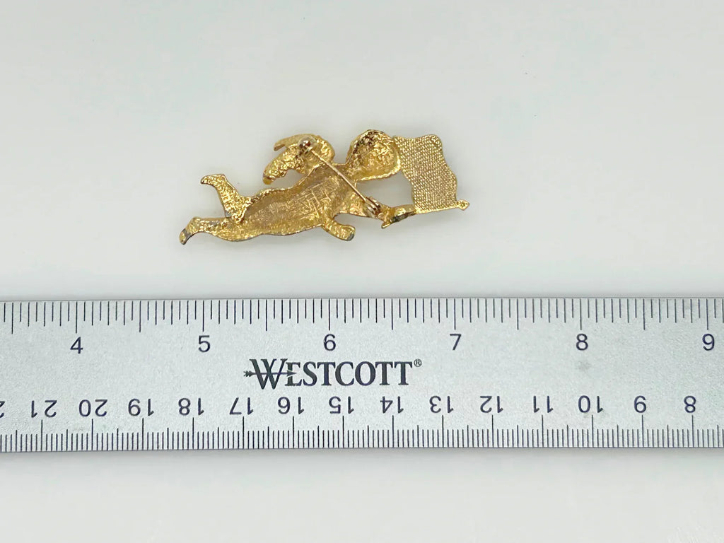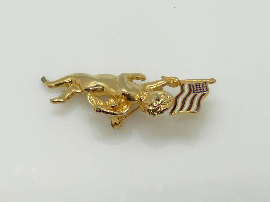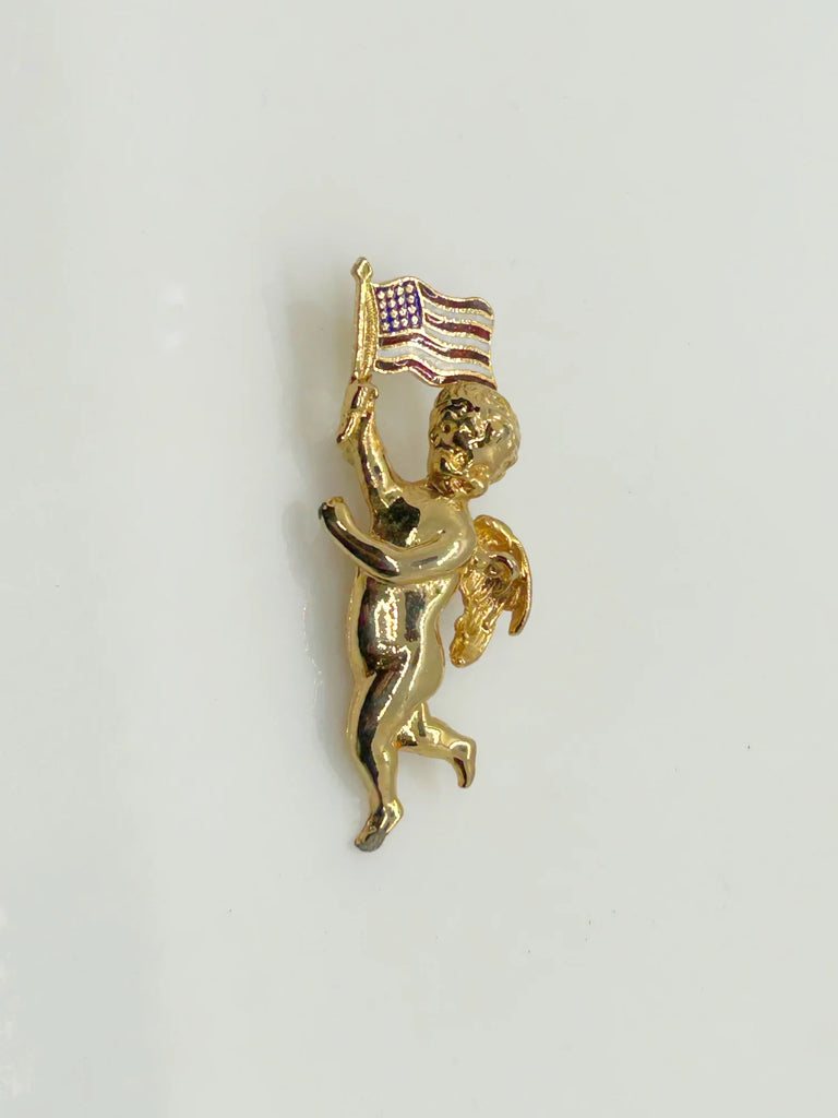 Celebrate timeless patriotism with this vintage cherub angel brooch, beautifully adorned with the American flag. Its intricate design and vibrant colors bring a nostalgic charm that complements any style, whether pinned to a jacket, hat, or bag. Measuring 2 1/4" in length, this brooch is not only a bold statement piece but also a meaningful addition to your vintage collection. Perfect for collectors and those who appreciate classic Americana, it offers a unique way to express pride and individuality with elegance and flair.