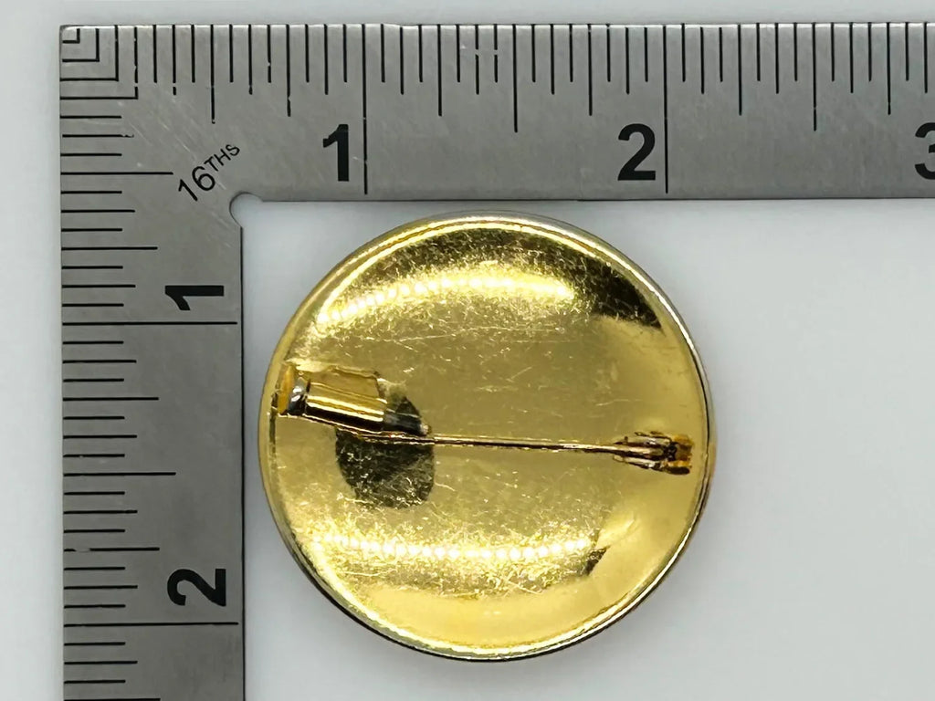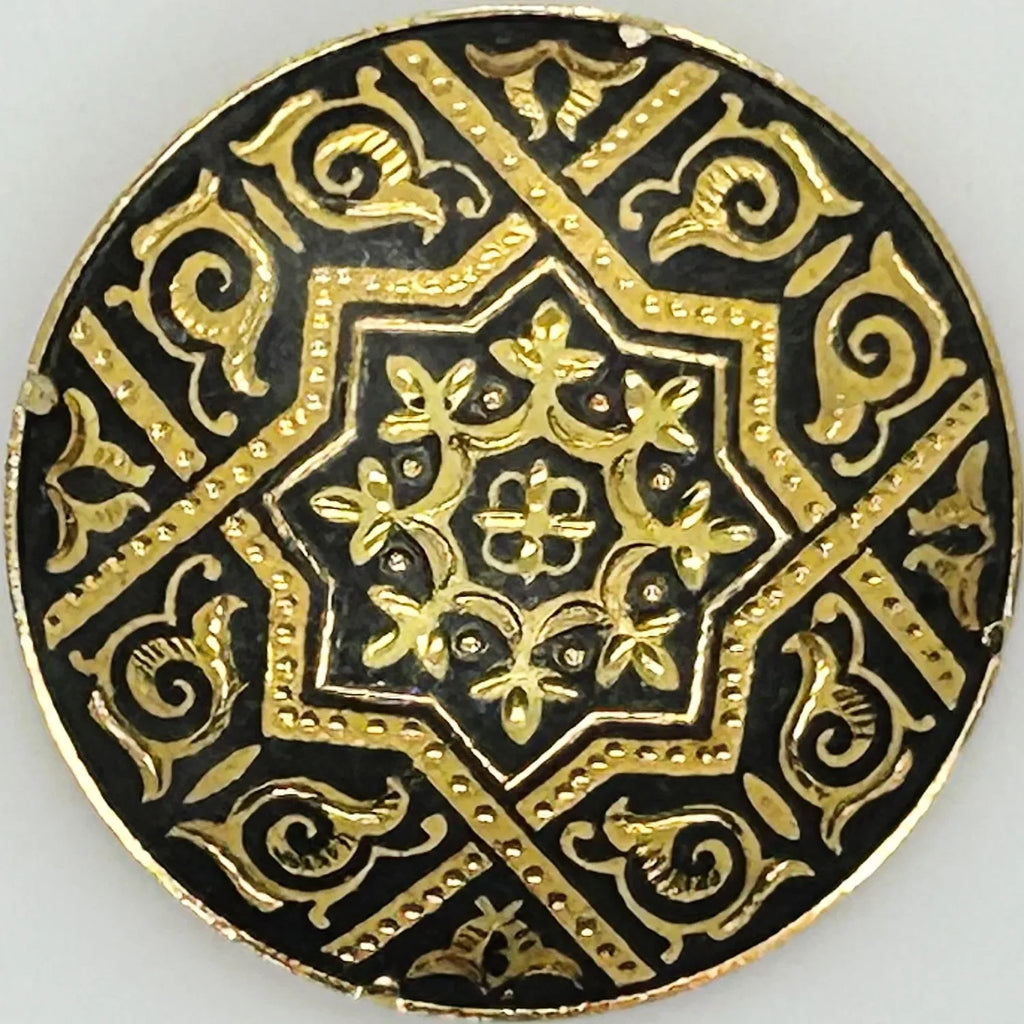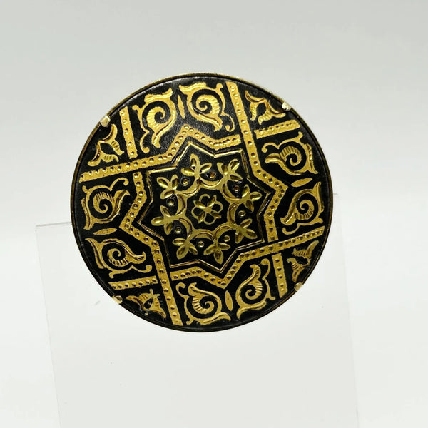 This brooch is a beautiful example of Damascene jewelry, which is made of etching into the metal, hammering gold or silver on to the base and using a liquid to oxidize and create the black background. The design originates from Europe and the Middle East, and often features geometric (as seen here) designs and those of birds and nature. This brooch is an example example and has sharp, crisp lines and is slightly curved. It measures 1.5" in diameter and is in excellent condition.