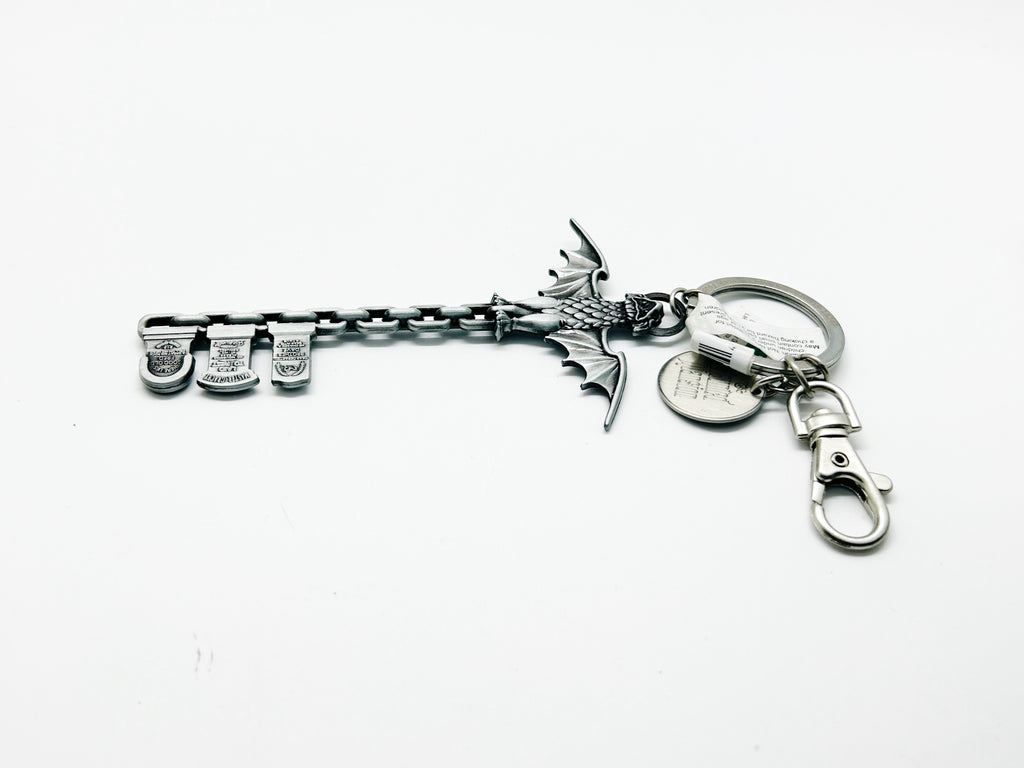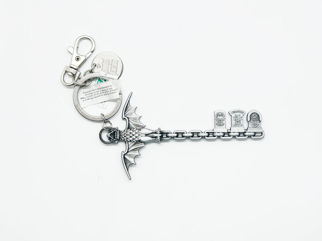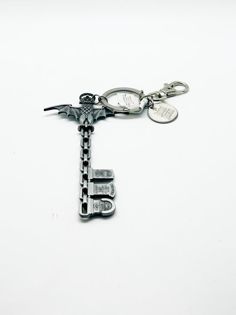 Bring the haunting charm of Disney's iconic Haunted Mansion to your everyday with this dramatic and collectible key chain, affectionately known as the "bat wing key chain." This authentic Disney Parks exclusive accessory is meticulously crafted from durable zinc alloy, perfectly capturing the Gothic elegance and eerie allure of the classic attraction. The key chain boasts a distinctive winged design, an iconic logo plaque, and a charming pendant featuring the enigmatic Madame Leota. Completing the design, the attached key showcases a captivating skeleton key design adorned with bat wings. To appreciate its size, this exquisite key chain measures approximately 5.85 inches in height, 2.6 inches in width, and 0.35 inches in length.