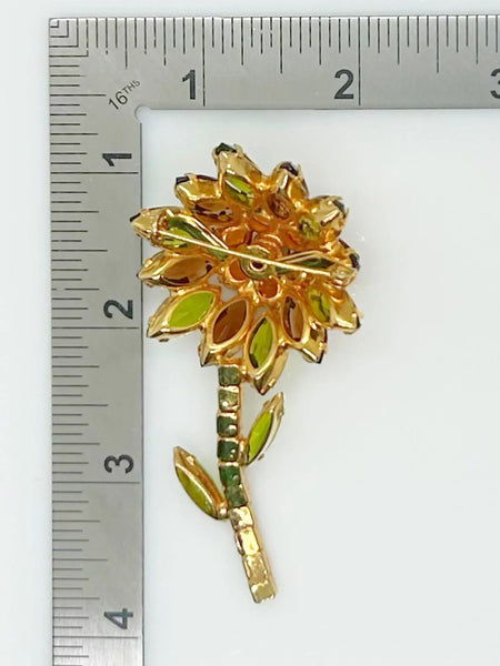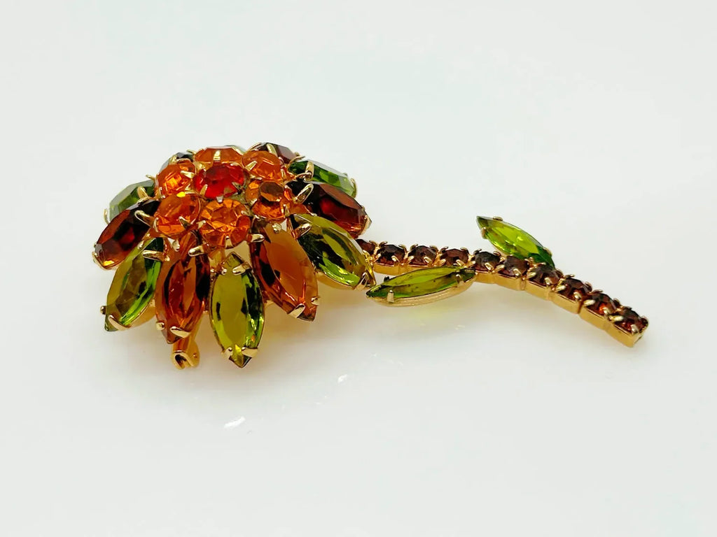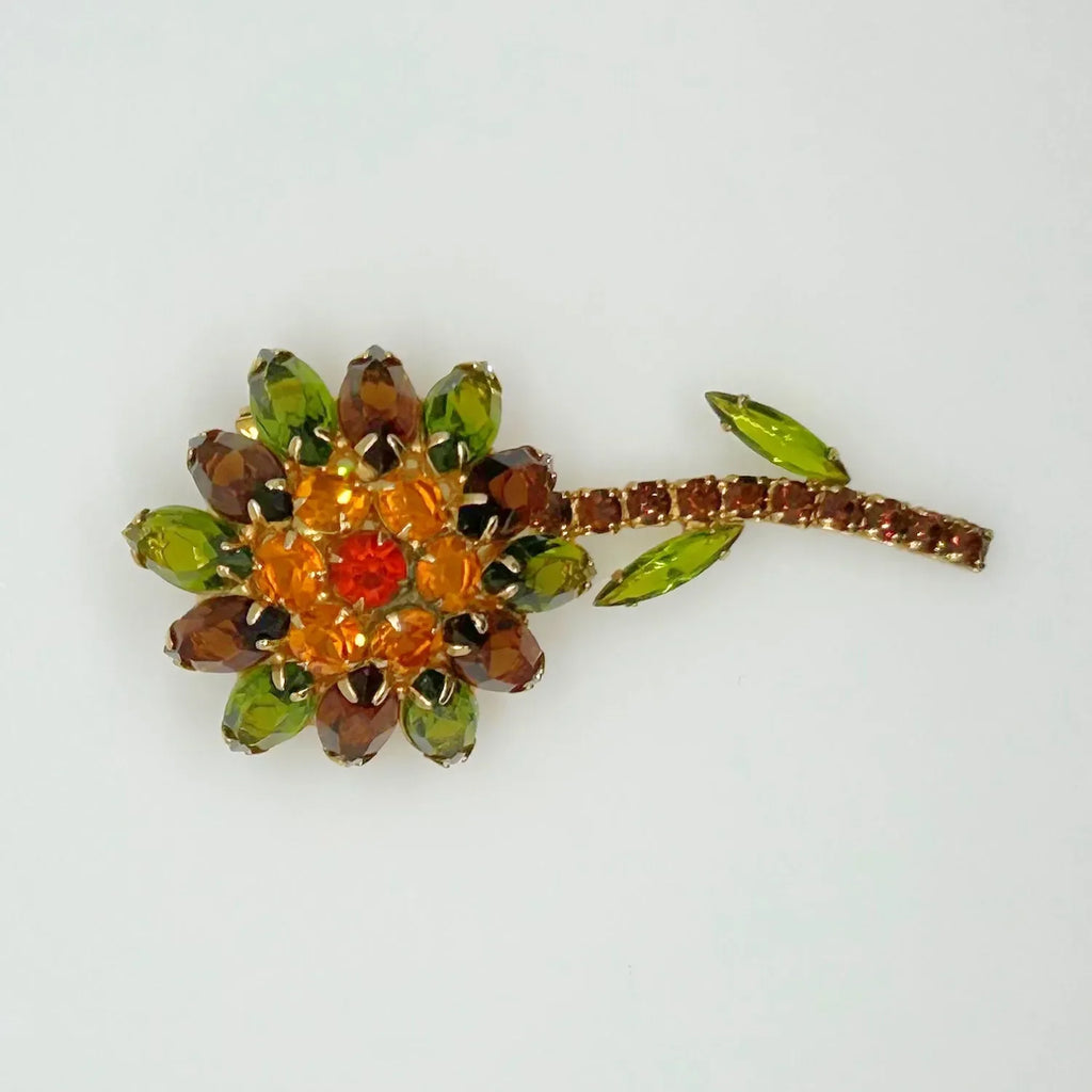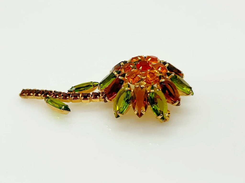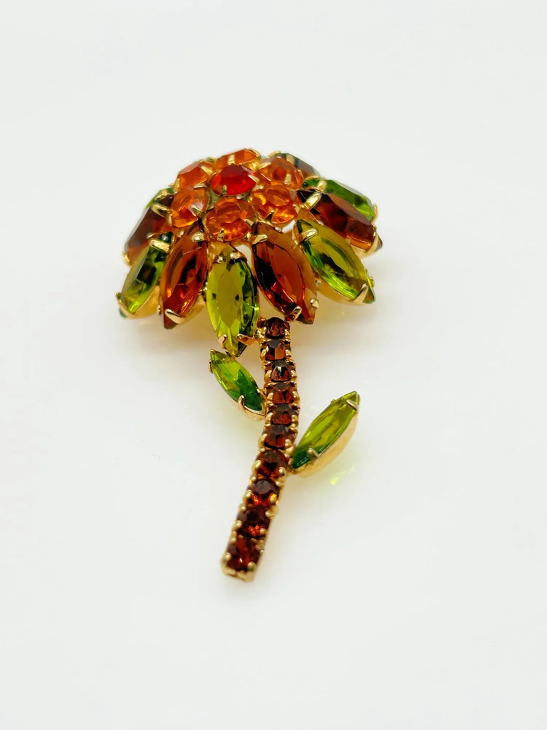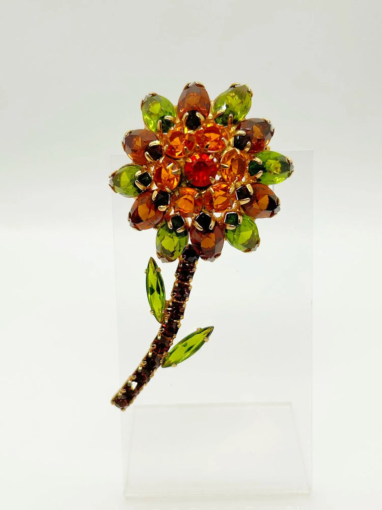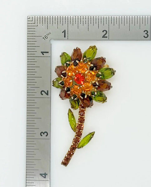 Add a touch of vintage elegance to any outfit with this stunning domed brooch. Featuring a colorful array of green, gold, amber, and orange rhinestones, this 1960's floral stem brooch is a true statement piece. The large 13.5mm by 7mm petals are accented with a 6.5mm golden round stone and a 6mm orange stone at the center, adding even more depth and sparkle to this already eye-catching design. At 3" in length and just over 1.5" at the blossom, this brooch is the perfect size to make a statement without overpowering your outfit. Trust us, you won't be able to resist adding this unique and timeless piece to your collection! Free Shipping