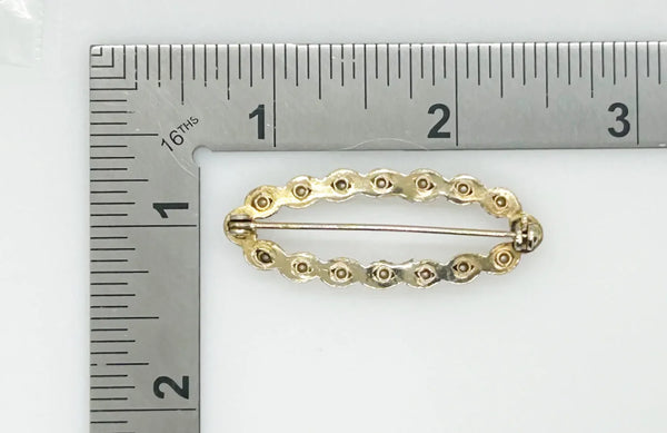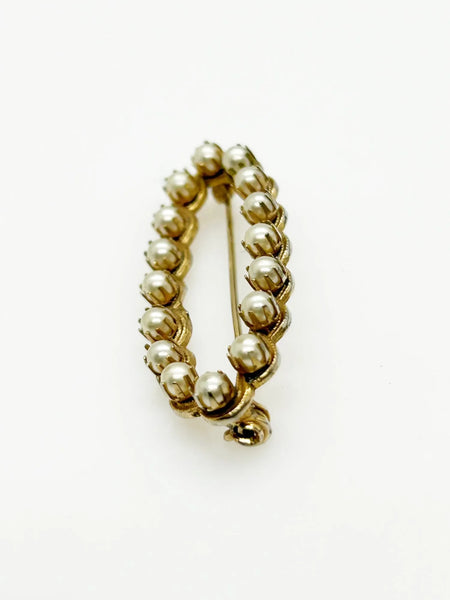 Crafted from lustrous gold tone metal, the brooch measures 1 3/4" and is in excellent condition, offering a durable and luxurious touch to your collection. Its open design with round faux pearls delicately spaced along the perimeter adds texture and sophistication to your look. The practical clasp ensures easy attachment and security on jackets, scarves, or hats, making it an indispensable accessory for daily wear or special occasions.