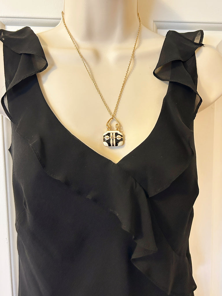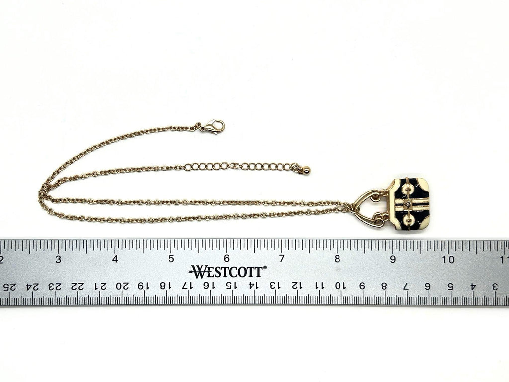 Take your your accessory game to the next level with this enchanting vintage purse necklace, a miniature work of art that celebrates timeless style. The handbag-shaped pendant showcases exquisite black and cream enamel detailing with bold geometric striping, evoking the sophisticated aesthetic of luxury designer bags from the 1980s-1990s era. Suspended from a graceful triangular bail, this petite treasure measures approximately 1 inch wide by just under 1 inch tall and adjusts from 17 to 20 inches in length, making it versatile enough for layering or wearing solo. Perfect for vintage enthusiasts and fashion-forward collectors, this whimsical statement piece brings nostalgic charm and refined craftsmanship to any ensemble.