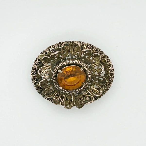This lovely vintage brooch has a beautiful golden faceted oval stone surrounded by layers of elaborately detailed filigree. The workmanship is outstanding. The stone is prong set and secure; it's a very wearable brooch. It measures 1.5" across and is in very good condition.