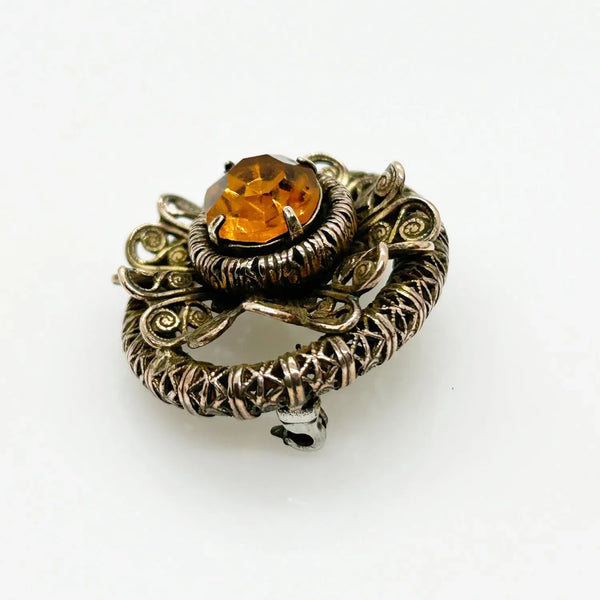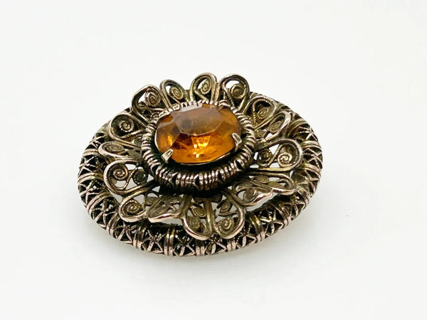 This exquisite vintage brooch showcases masterful European craftsmanship at its finest. The stunning amber-colored faceted oval stone is expertly prong-set and surrounded by intricate layers of ornate filigree work that demonstrates the exceptional artistry of its era. Measuring 1.5" across, this piece strikes the perfect balance between statement-making presence and wearable elegance. The secure stone setting and excellent condition make it ready to transition seamlessly from your collection to your everyday wardrobe or special occasions.