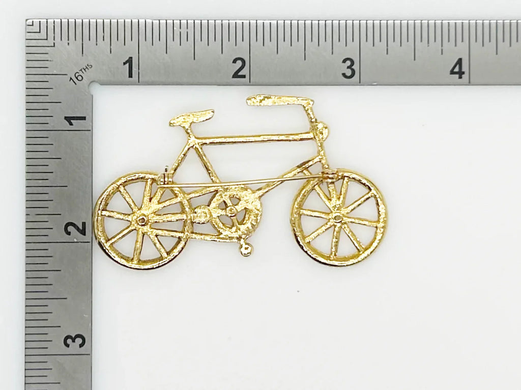 Get ready to ride in style with this adorable Gold and Black Bicycle Brooch! The intricate detailing, complete with black enamel rims and a sparkling rhinestone headlamp, will add a touch of playful charm to any outfit. Plus, at 2.75” long, it's the perfect size to make a statement without being too flashy. Don't miss out on this like-new gem for your collection!