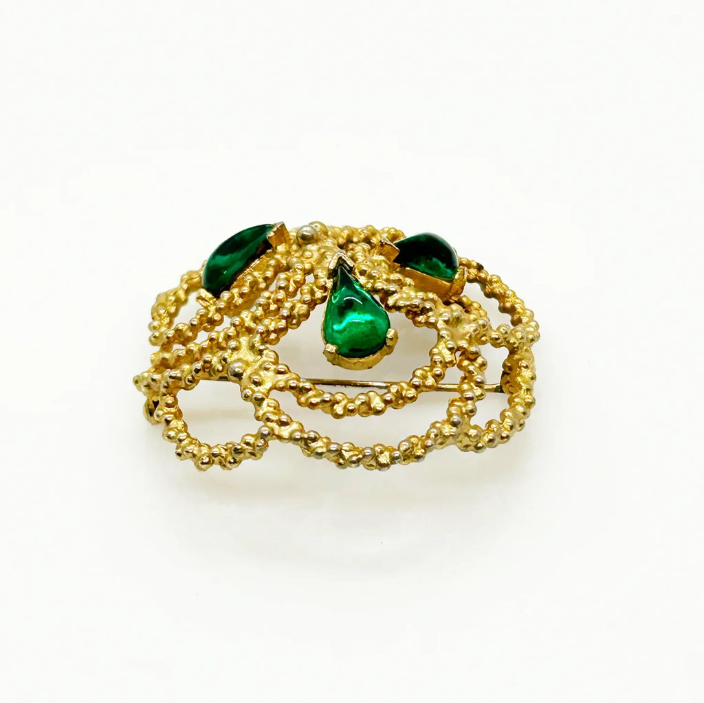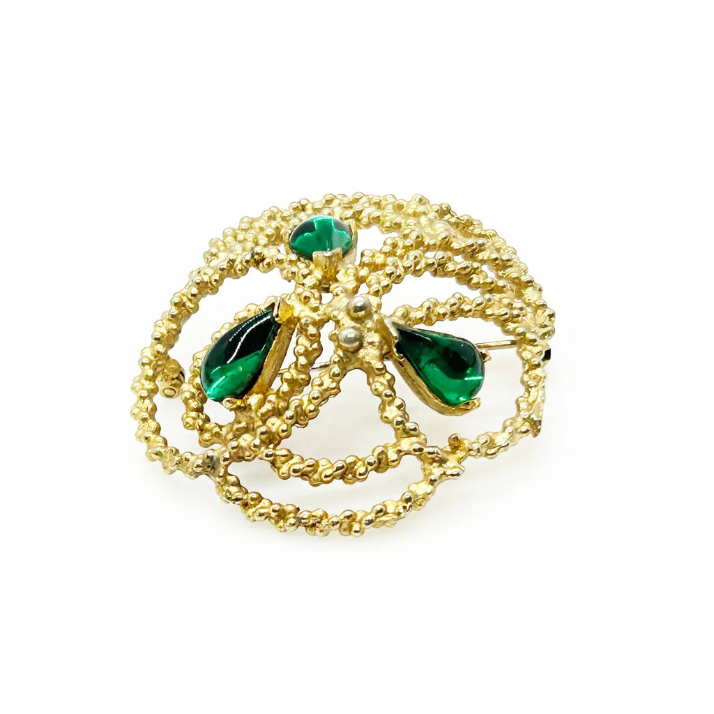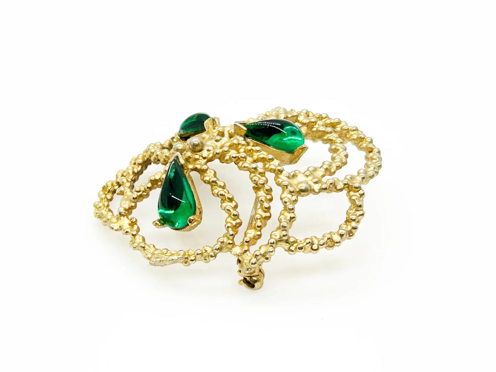 This is an unusual and eye catching vintage Dalshiem brooch. It has textured gold tone metal swirls in an abstract pattern. Teardrop shaped emerald green cabochons add measures additional flair. This brooch measures about 2x2", and as you can see, it is domes and three dimensional. Excellent condition, and signed Dalsheim on the back.