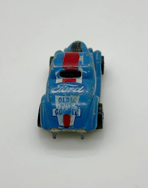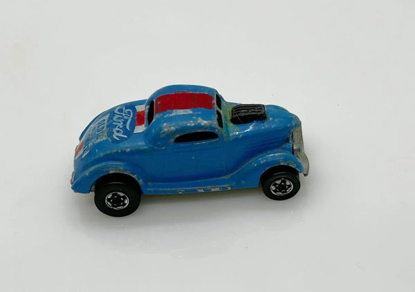 Flying Colors, light enamel blue, with red, white and blue tampos, including "oldie but goodie" and "Ford". It has no windows, and a black interior. The wheels are BW. This car was modeled after a 1936 Ford Coupe, and designed by Larry Wood. It was made in Hong Kong. Wear on paint.