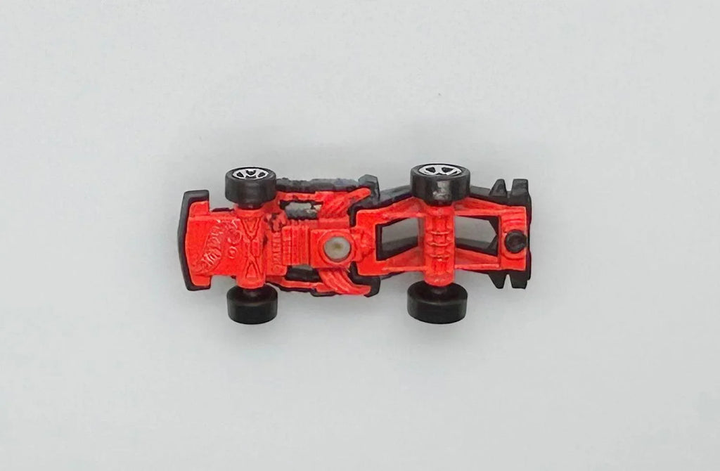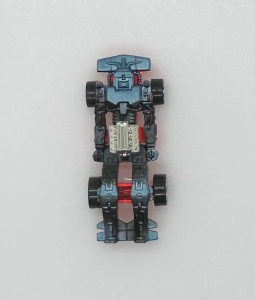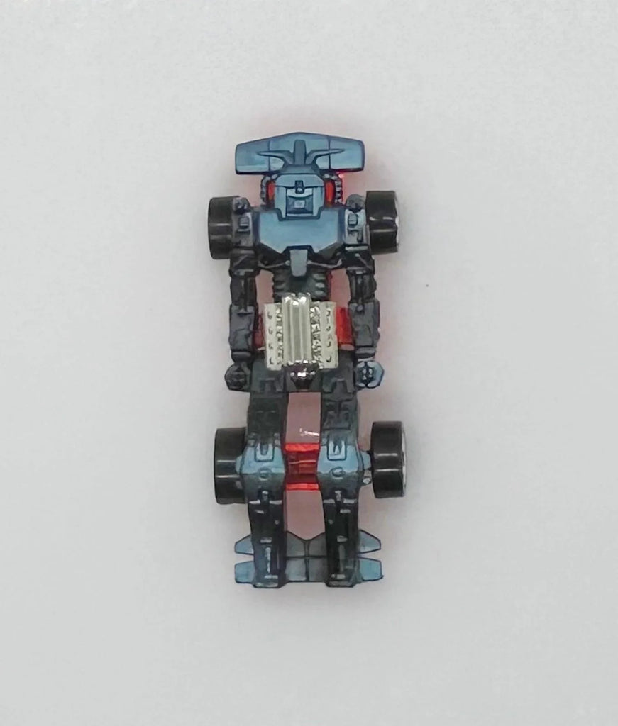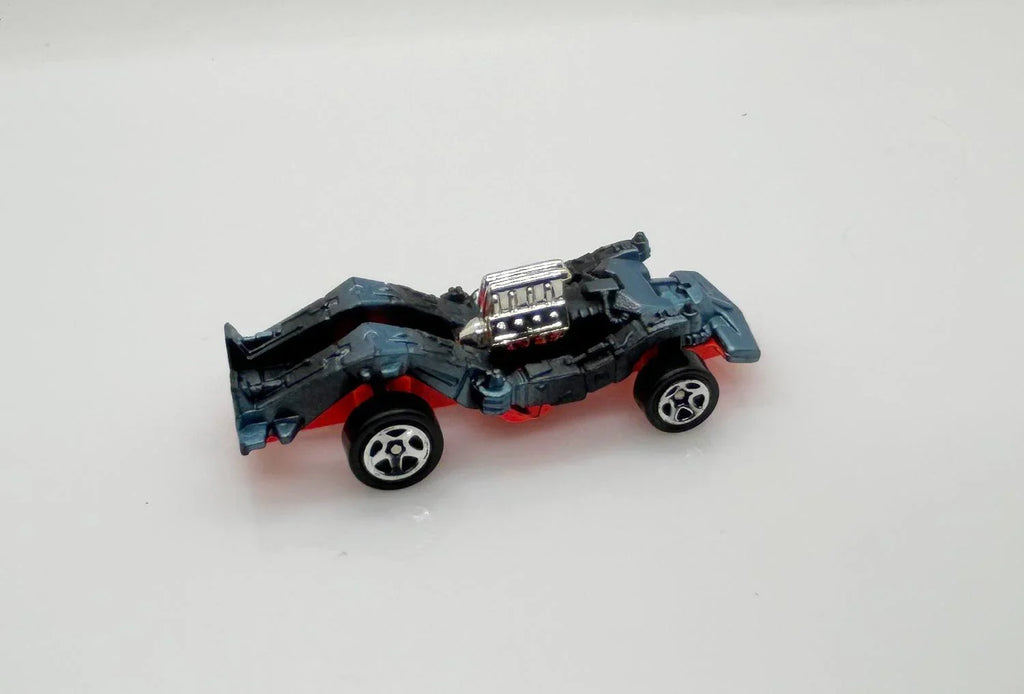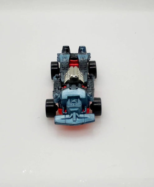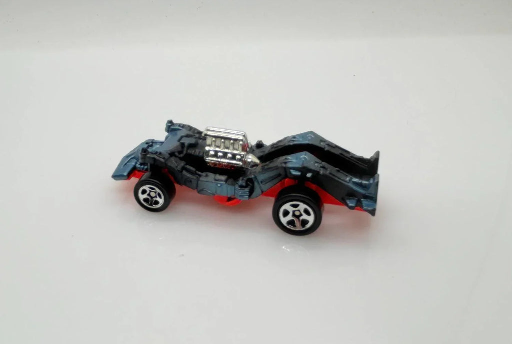 Computer Warrior, Mainline, black and blue with orange base. The exposed engine is chrome, the wheels are 5Sp. It was designed by Larry Wood and made in China. #479.