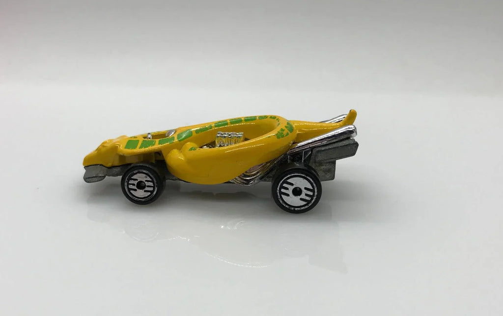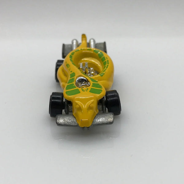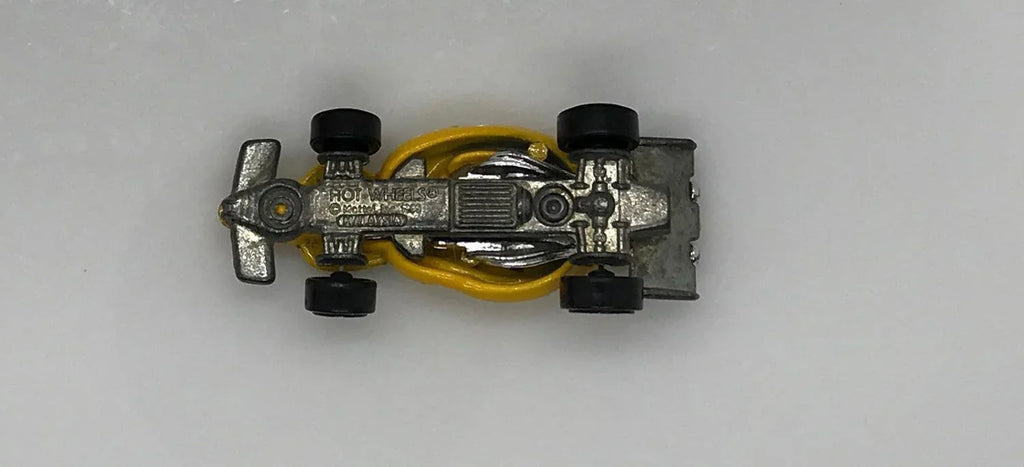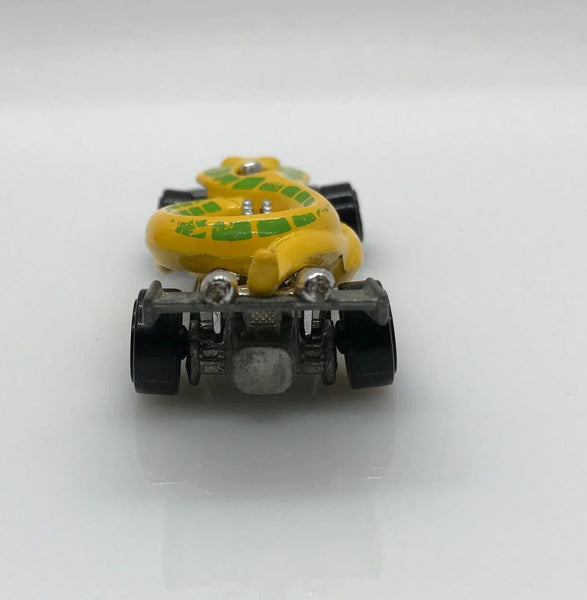 Bright yellow with green spots, chrome interior. #2061, with UH wheels. Made in Malaysia, 1:64 scale. Designed by Larry Wood. Wear on green spots.
