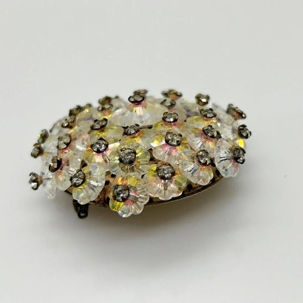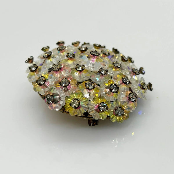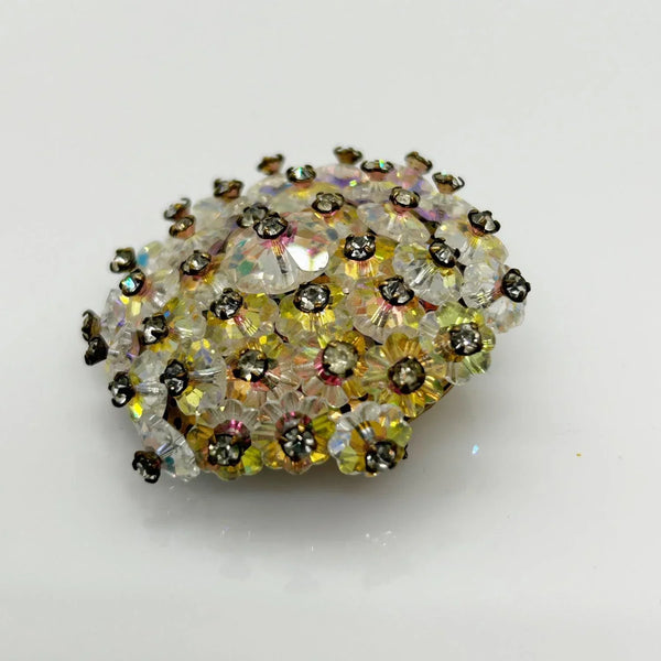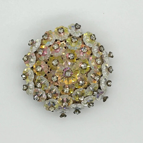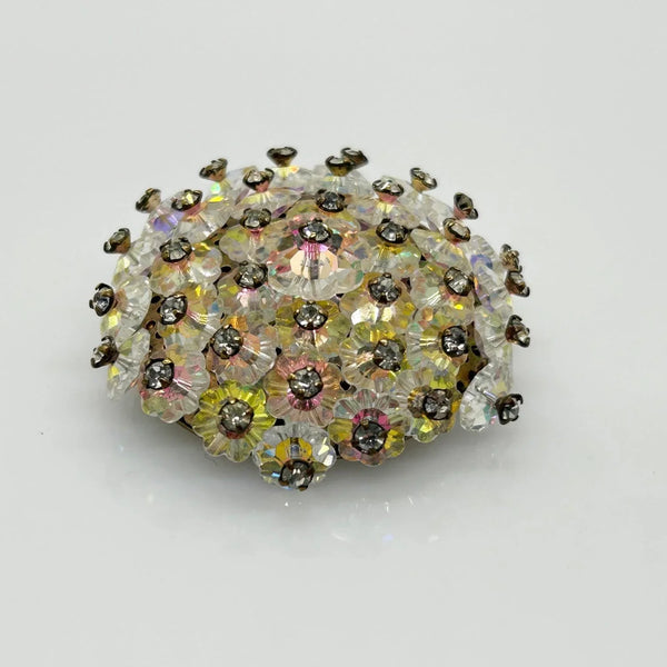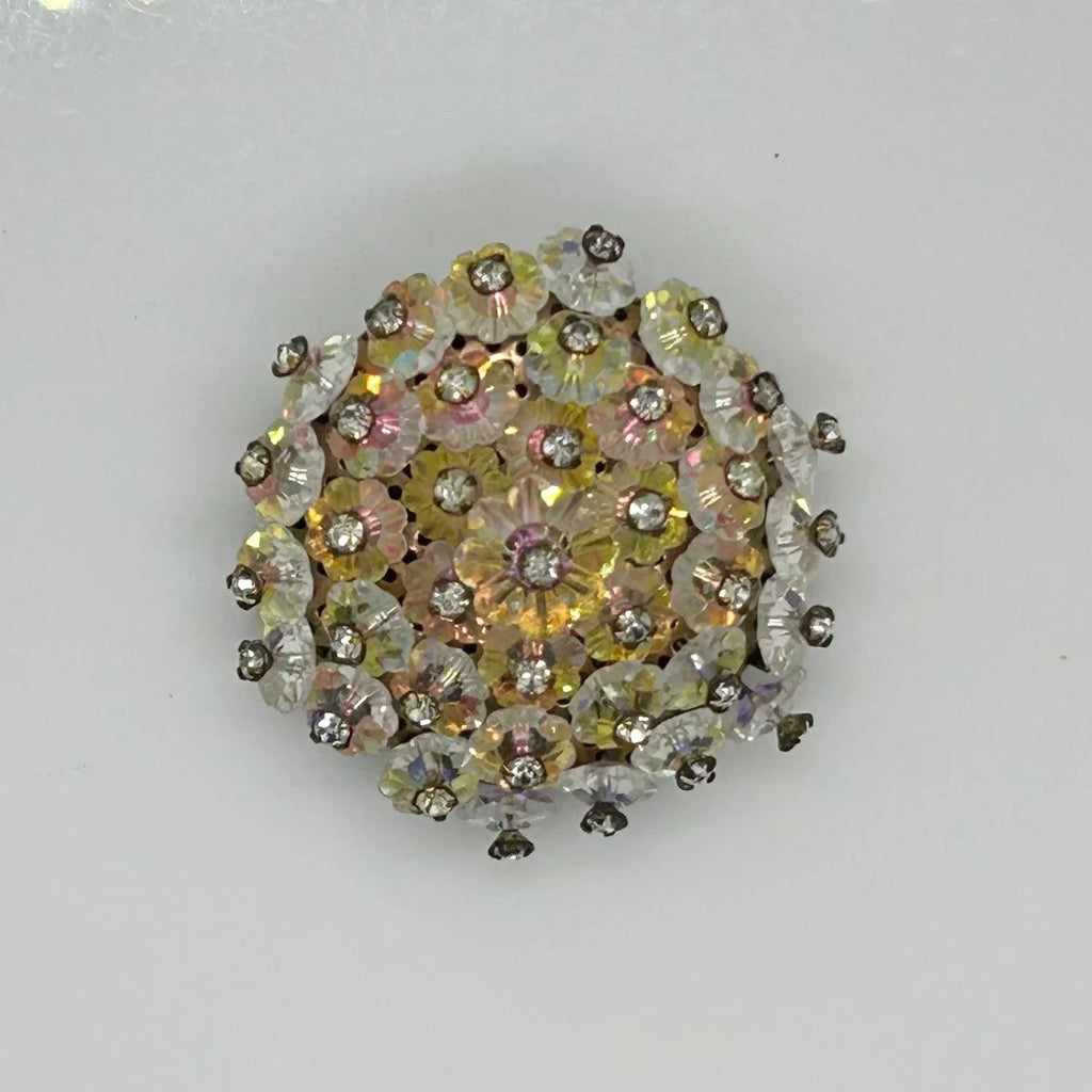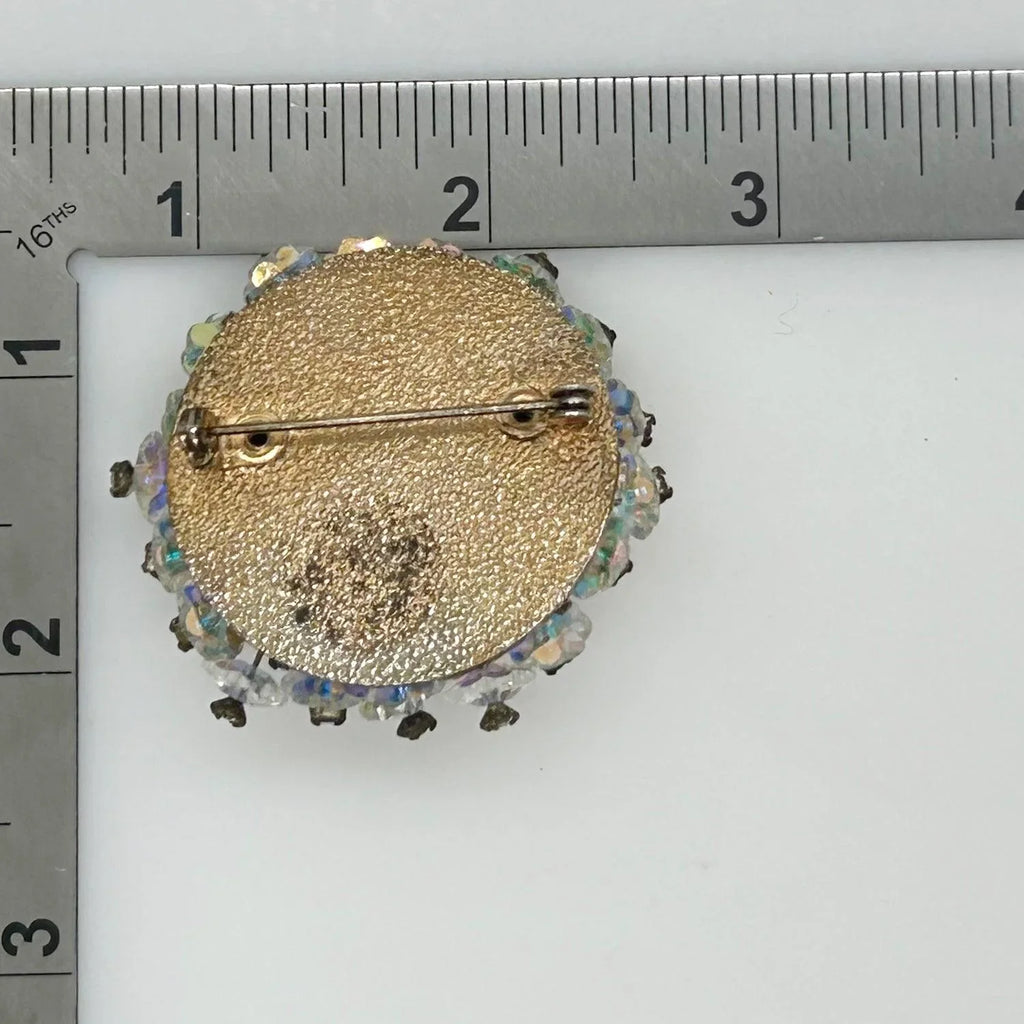 Add a touch of vintage glamour to any outfit with this stunning iridescent brooch! The alternating round and layered elements create a unique design that is sure to catch the eye. The luminescent floral beads and hand-set rhinestones add a touch of elegance and sophistication, and its slightly domed construction catches the light from any angle. And with its size of 1.5” , it is easy to wear without being overpowering. There is a small touch of residue on the back, but don't miss out on this one-of-a-kind accessory that will elevate any look!
