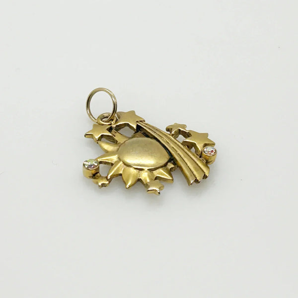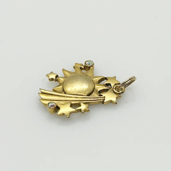Embrace the beauty of the stars with our JJ Stars and Sun Vintage Pendant! This stunning pendant boasts a shining matte gold sun and dazzling shooting stars, embellished with tiny iridescent rhinestones that shimmer in the light. Measuring just over an inch in length, it is the perfect size to make a statement without weighing you down. And to top it all off, it is in excellent condition, making it a must-have for any jewelry lover. Add a touch of celestial magic to your outfit with our vintage pendant today!