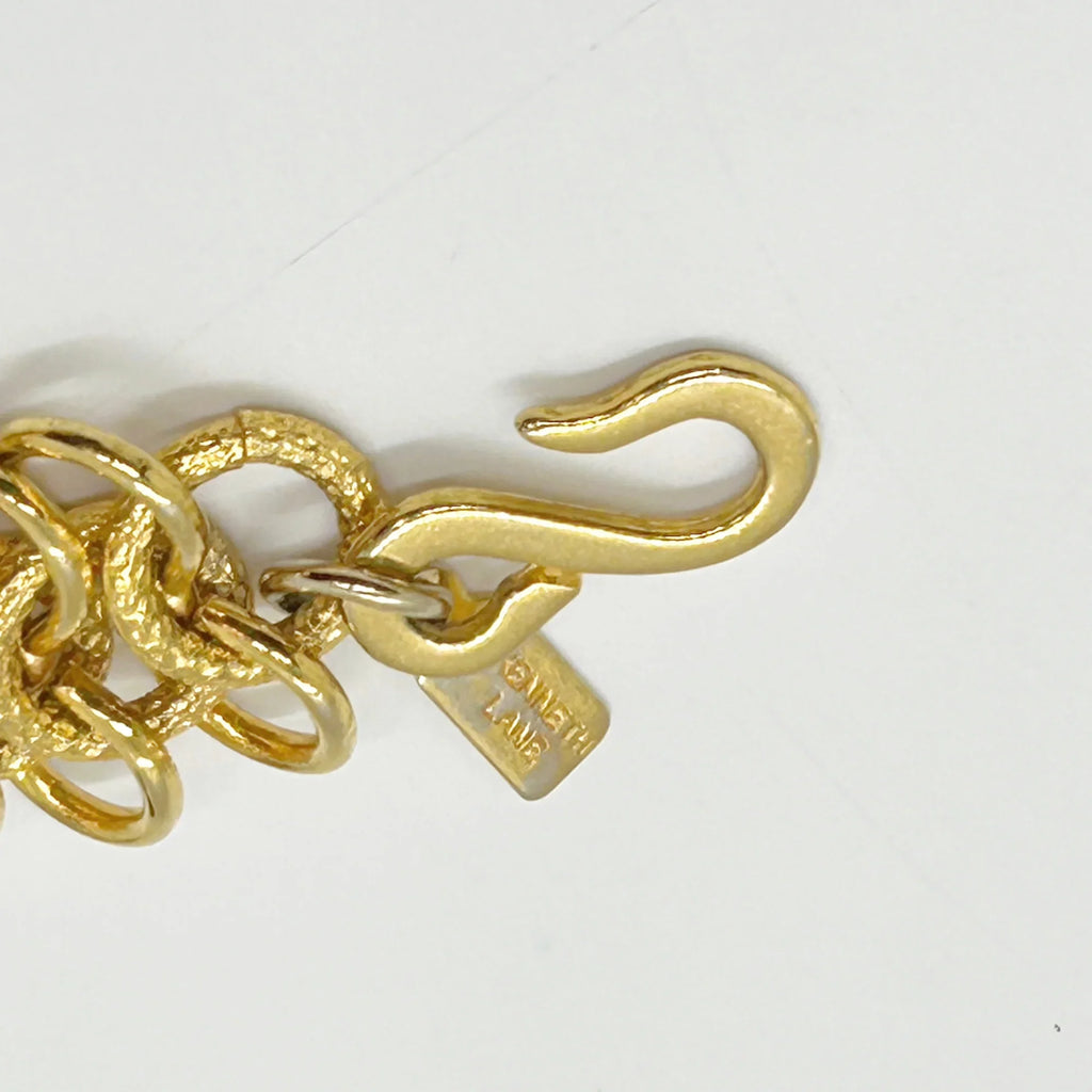 Transform your look into one of sophistication and elegance with this stunning chain link Kenneth Lane necklace. The rich matte gold tone dazzling beads of varying sizes add a whimsical touch to this luxurious piece. Adorned with a rectangular hang tag engraved with the signature Kenneth Lane in bold letters, this necklace is truly a work of art. Despite some minor signs of wear, it remains in excellent condition, and measures 15" long with a hook clasp. This is the perfect addition to any fashionista's collection.