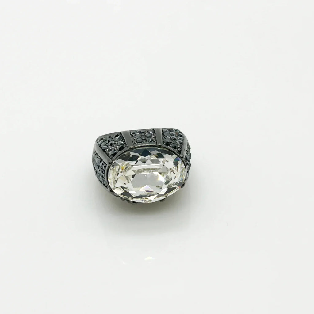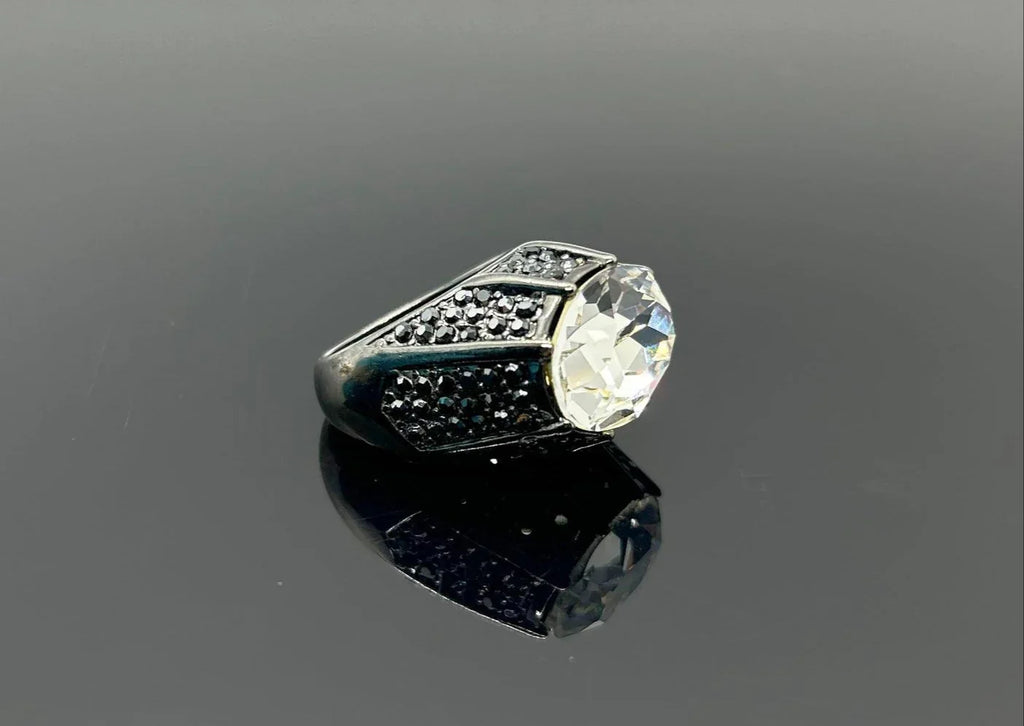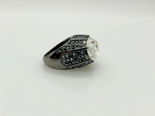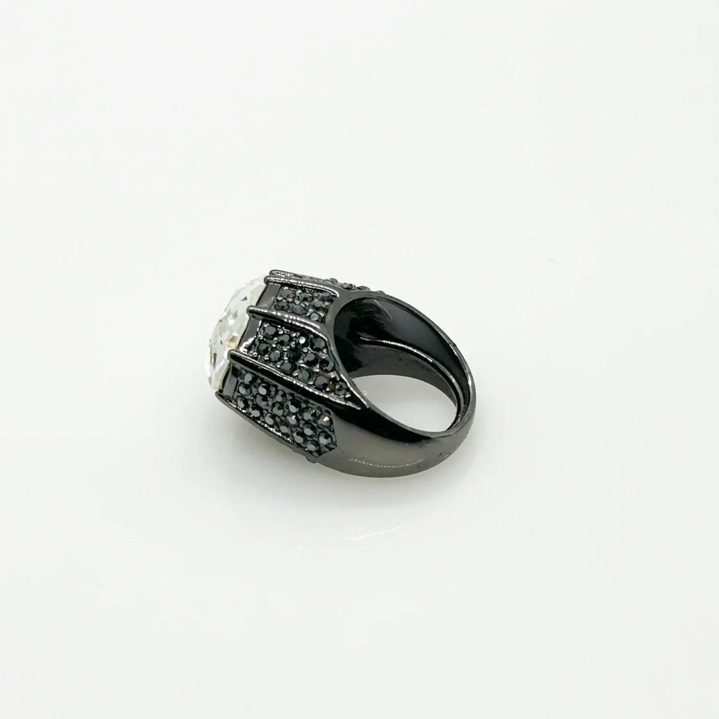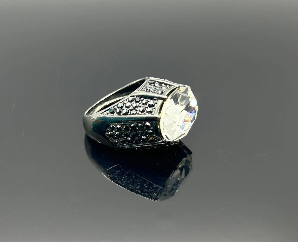 This hard to find ring will turn heads! It is made of a large clear oval center sparkling stone, set among faceted black stones in a gunmetal color. Adorn your fingers with this stunning statement piece. This ring boasts a captivating large clear oval center stone and is surrounded by intricately cut faceted black stones, all set in a sleek gunmetal color. Get ready to stand out from the crowd and leave a lasting impression wherever you go. It measures size 6.5. Free Shipping