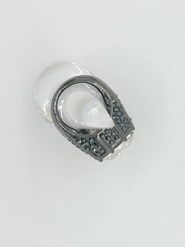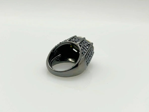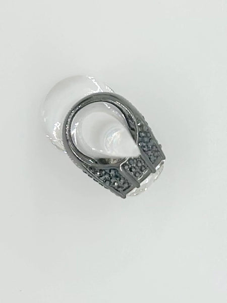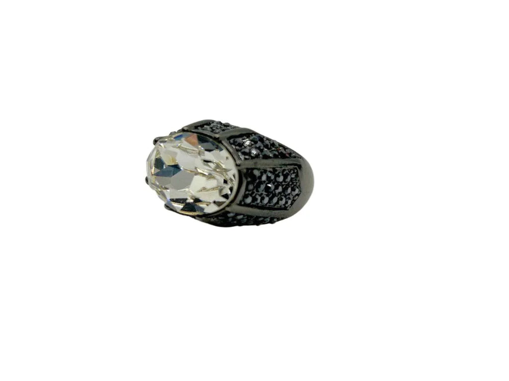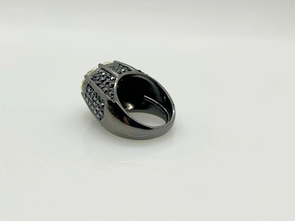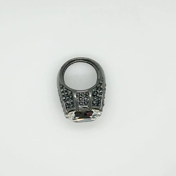 This hard to find ring will turn heads! It is made of a large clear oval center sparkling stone, set among faceted black stones in a gunmetal color. Adorn your fingers with this stunning statement piece. This ring boasts a captivating large clear oval center stone and is surrounded by intricately cut faceted black stones, all set in a sleek gunmetal color. Get ready to stand out from the crowd and leave a lasting impression wherever you go. It measures size 6.5. Free Shipping