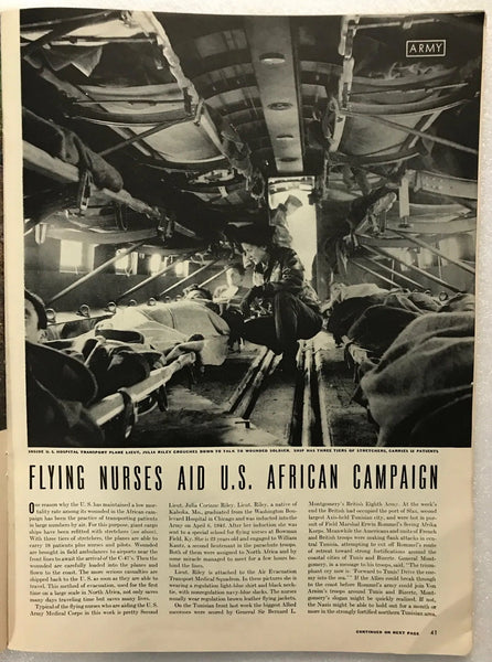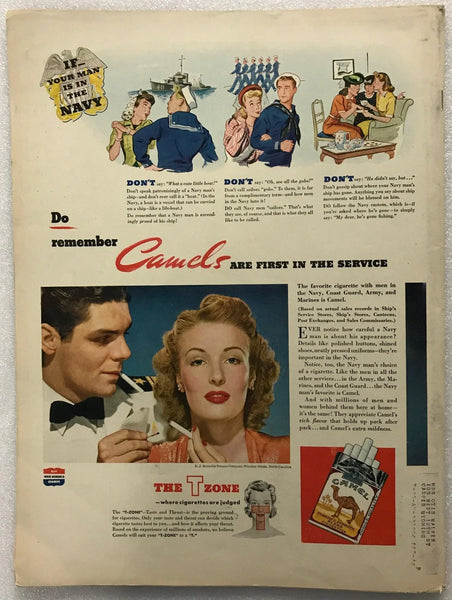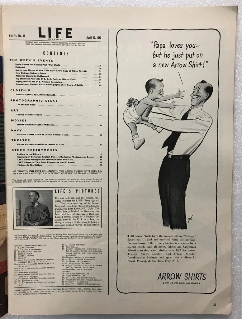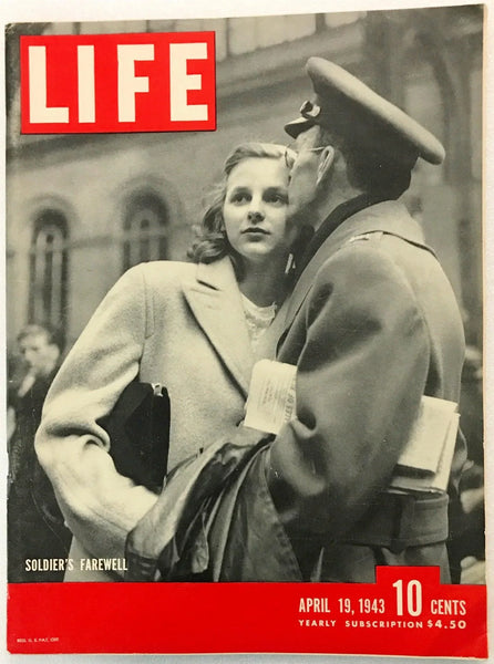 Cover: Soldier’s Farewell ; photographer Cecil Beaton; Franco’s Spain; Chicago subway; Madame Chiang in Hollywood (many photos of famous actors and actresses); artist Gladys Rockmore Davis; The American soldier and sobriety; Guadalcanal; Esther Williams; the human body is explained through illustrations; General “Tooey” Spaatz; ballerina Zorina plays Helen of Troy. The cover story shows the farewell of a couple married only four days.