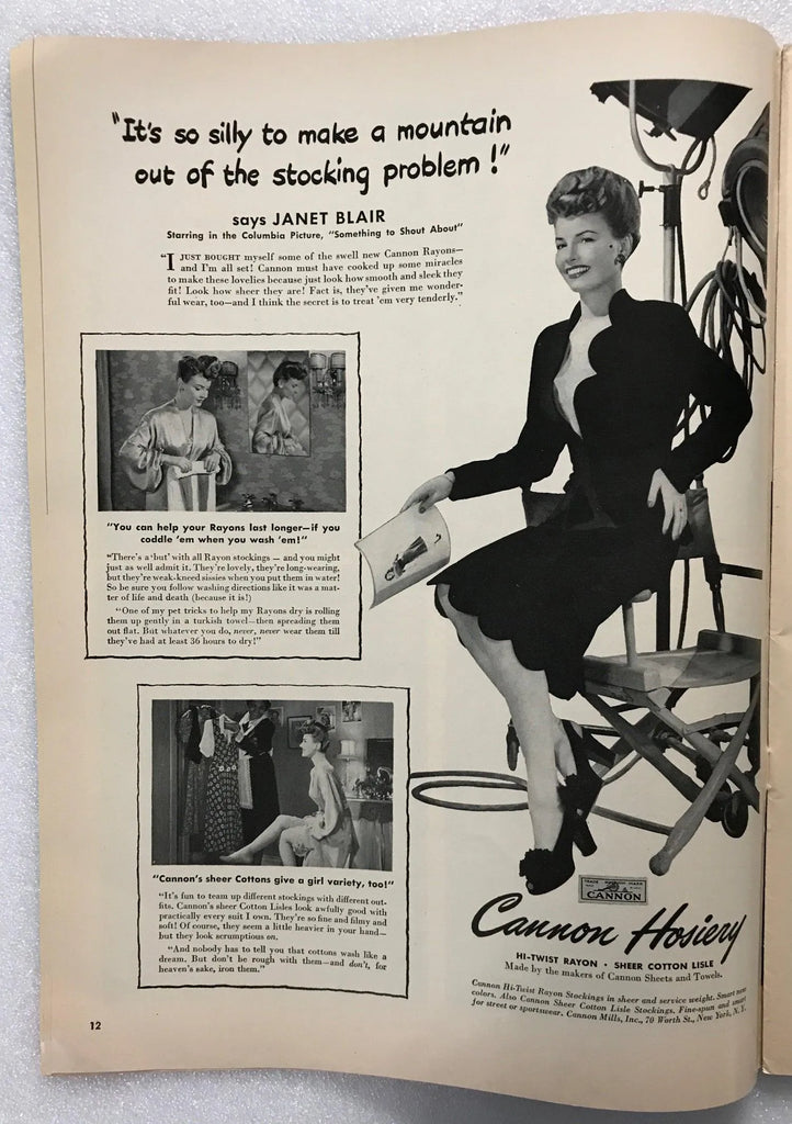 Ads include: actress Janet Blair stockings ad; Lilly Cache hat featured in Whitman’s Sampler ad; Mary Martin ad for Royal Crown Cola, among others.