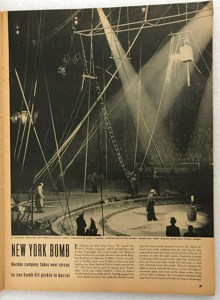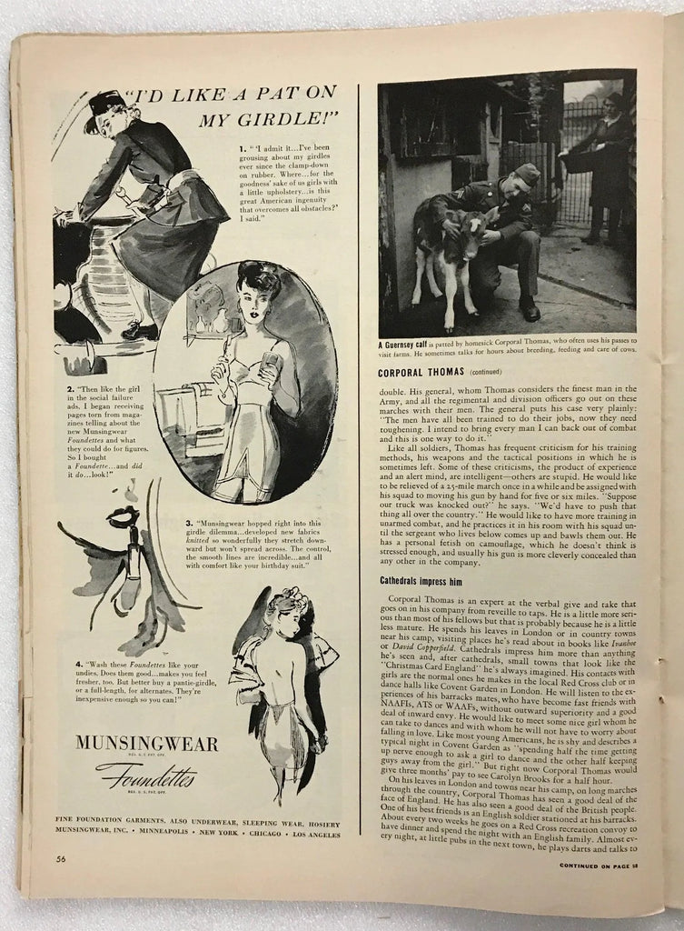 Cover: “Jango” and review of the movie “Song of Bernadette” starring Jennifer Jones; U.S. Troops hear violinist Yehudi Menuhin in London’s Albert Hall; officers’ teenage daughters become “Jangoes” – junior Army-Navy Guild nurses; excerpt of “One World” by Wendell Wilkie; fire, American troops in Tunisia; “Coffin Corner” in South Africa; a company entices crowds by showing a bomb explode a pickle in a barrel, celebrating a new weapons sight; Newport, RI Mansions are home to naval operations; color multi-page spread on Radio Music Hall; the Sultan of Morocco.