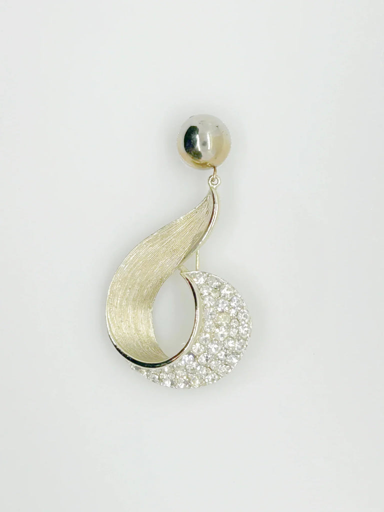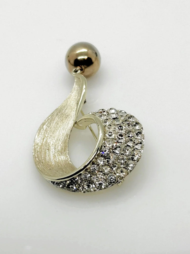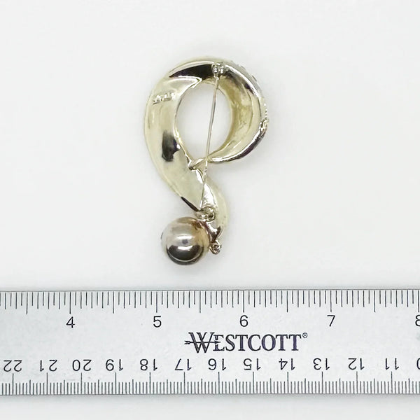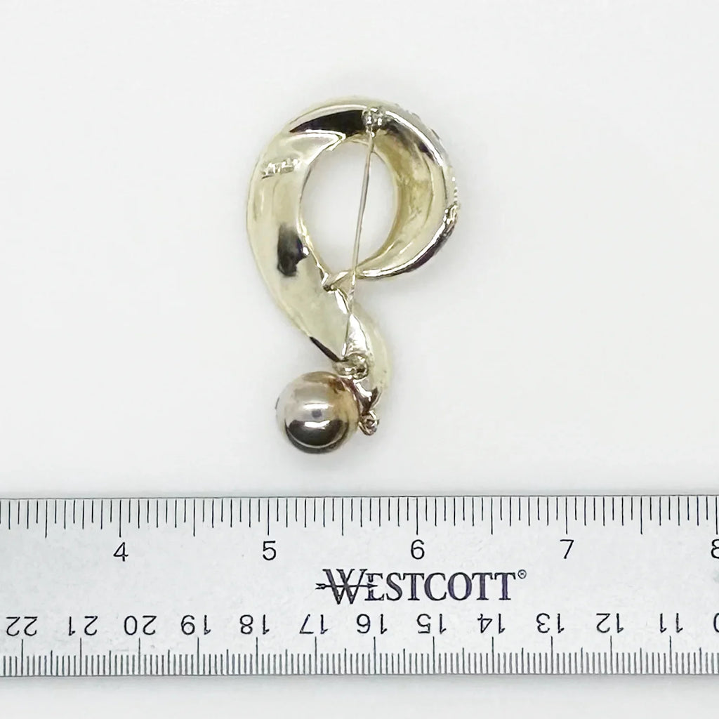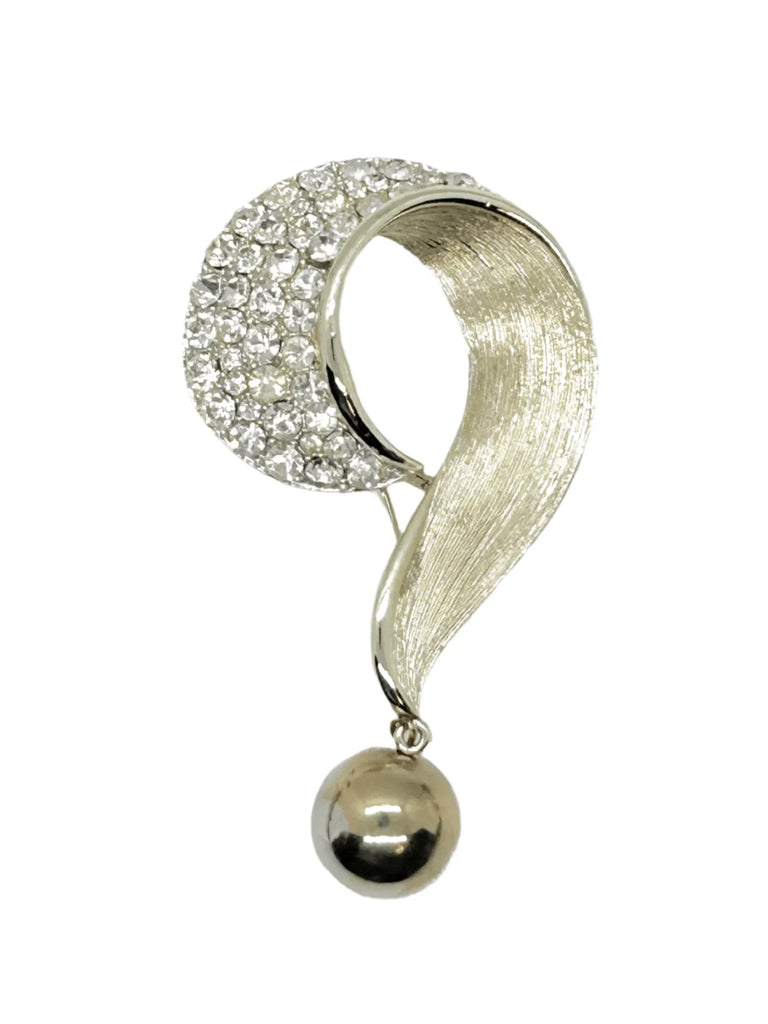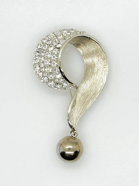 This 3" Lisner question mark brooch features a textured gold tone metal base, adorned with brilliant white rhinestones and a dangling sphere. Its vintage quality carries slight wear from age, but all components remain intact and sparkling.