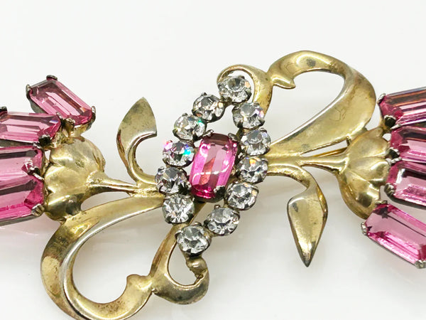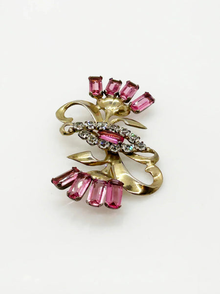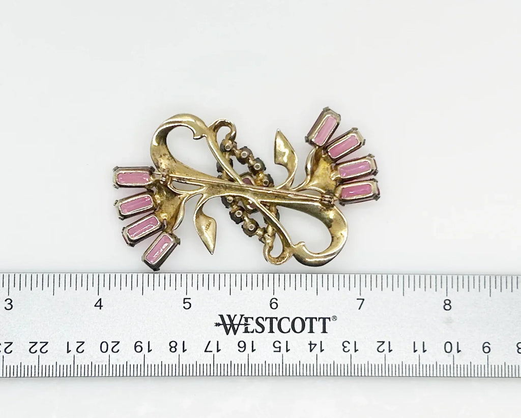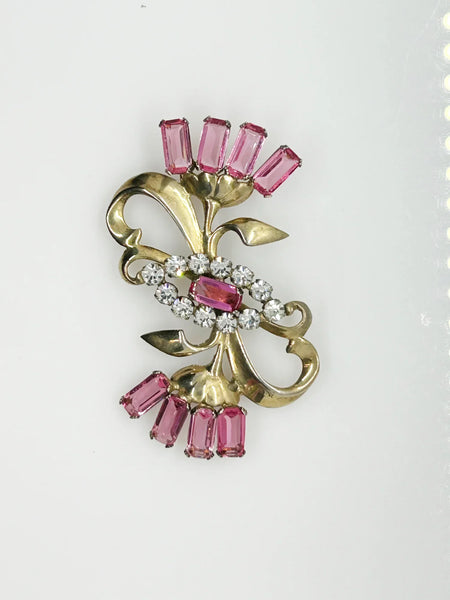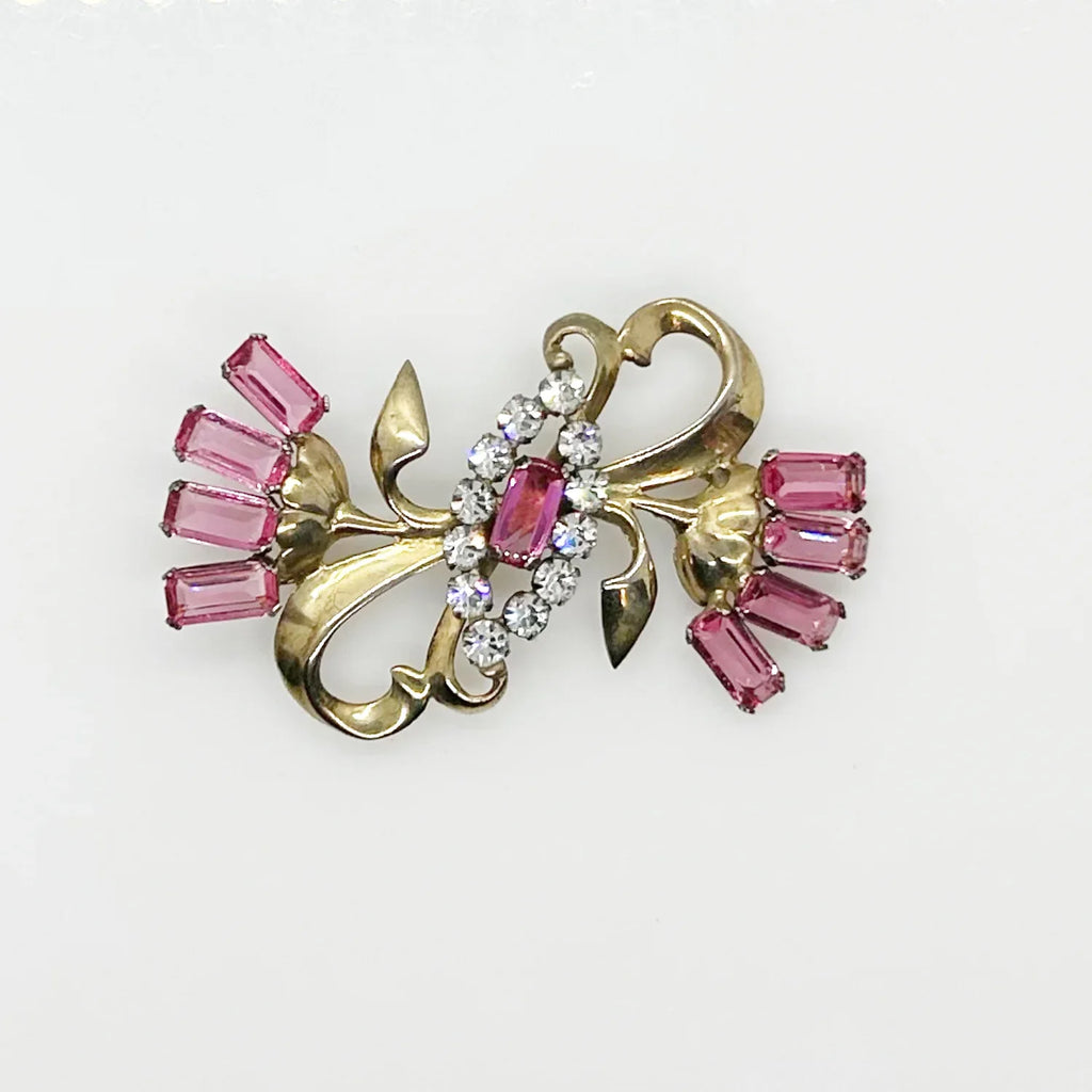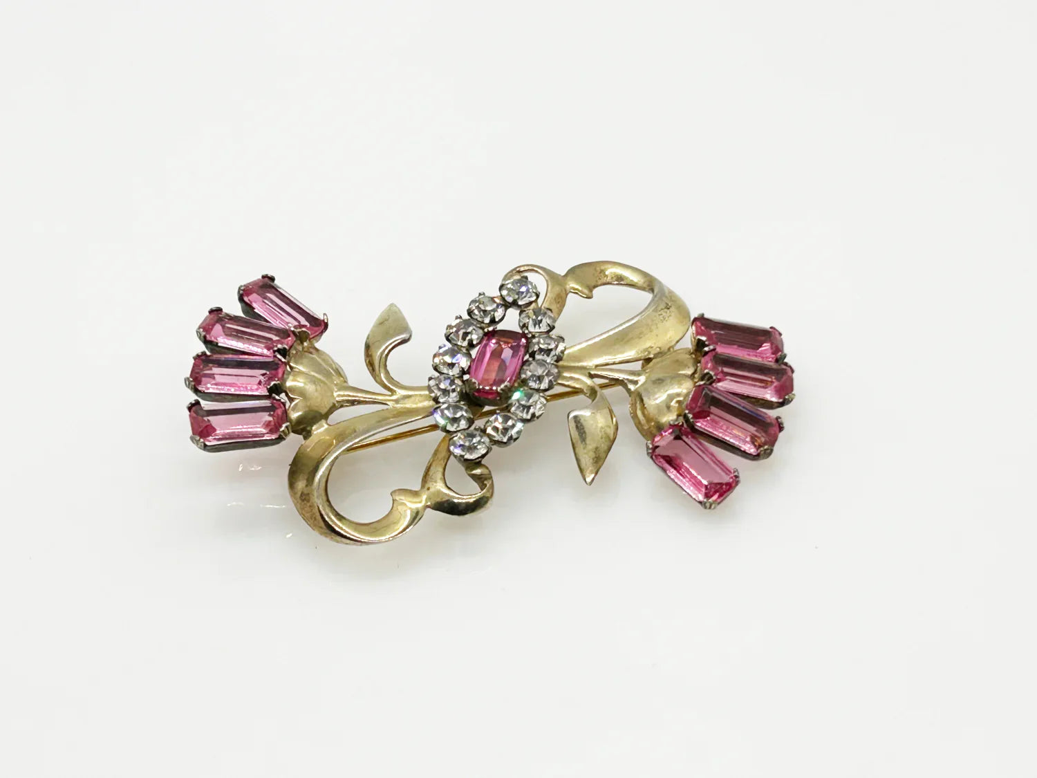 This stunning vintage brooch exudes the essence of classic style. Featuring delicate flowers adorned pink, faceted open back stones as petals, and with leaf accents on either end, the centerpiece boasts a striking marquise-shaped design embellished with dazzling white round stones and a magnificent pink emerald cut stone, mirroring those in the flowers. The open-back pink stones and prong setting add a touch of elegance to the piece.