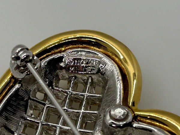 This is a bold and striking brooch by famed designer Nolan Miller. from his Glamour Collection. His pieces are consistently high quality and this heart shaped brooch is an excellent example of that, with it's smooth gold tone border and its perfectly set, clear and bright baguettes forming a woven-look appearance. The back is of equal quality. You'll see that the setting for the stones is silver tone, cast in a detailed yet still elegant setting. It is signed Nolan Miller in uppercase letters, and the pin measures 1.75" at its widest point. Free Shipping