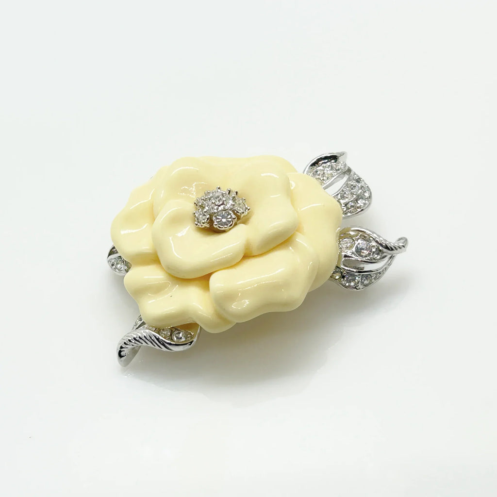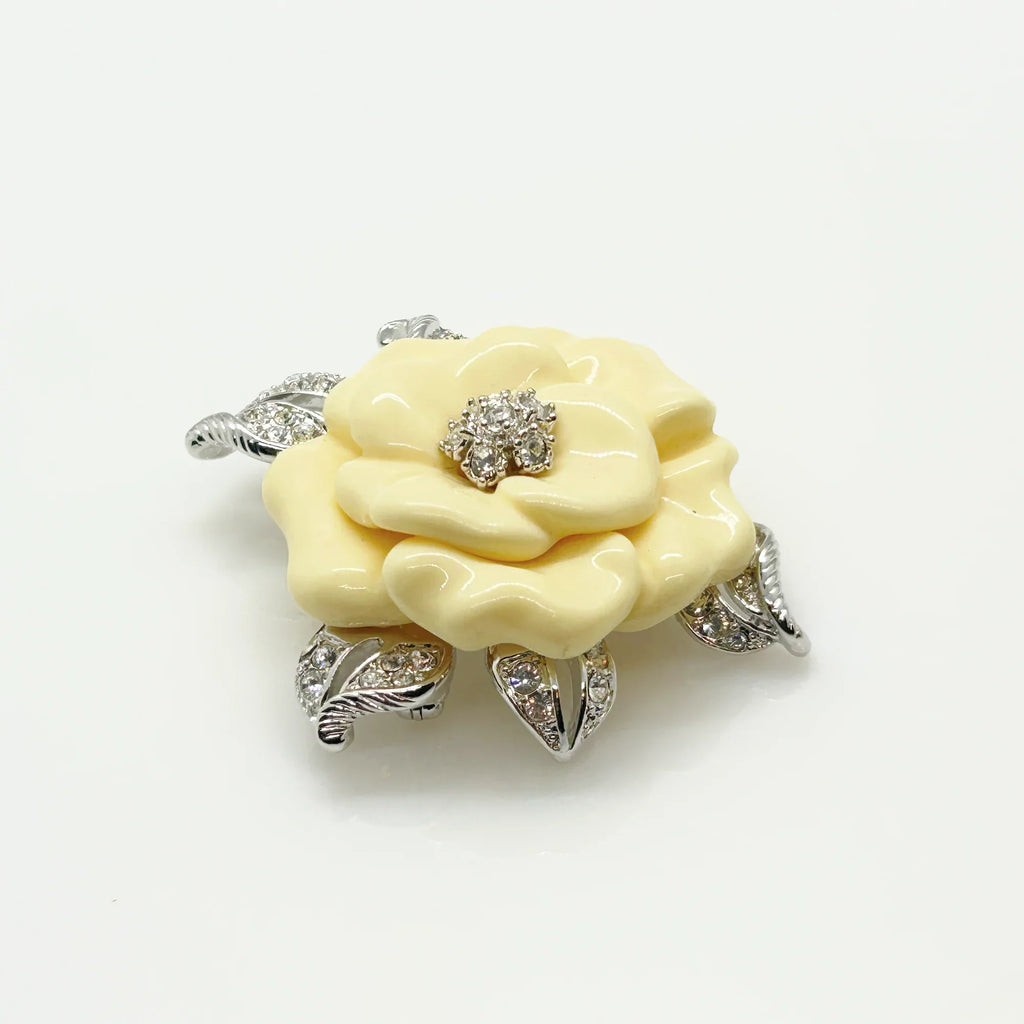 This brooch features a cream-colored camellia flower, skillfully molded from high-quality resin for a lasting, refined look. The crystal center sparkles with clear pavé-set Swarovski crystals, flawlessly complementing the delicate silver-tone leaves that surround the flower. The brooch’s centerpiece showcases stunning Swarovski crystals that add radiant brilliance and catch the light from every angle. The silver-tone leaves are intricately designed to enhance the brooch'’s natural floral aesthetic. Measuring approximately 2 1/2 inches by 2 inches, this brooch makes a bold yet sophisticated fashion statement.