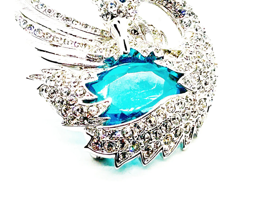 Expertly crafted from rhodium-plated silver-tone metal, the brooch features intricate pave-set Austrian crystals that brilliantly catch the light, complemented by a striking, massive, clear deep blue crystal as the focal point ofthe brooch. Thr dark blue eye adds a sophisticated and realistic detail and just the right placement.