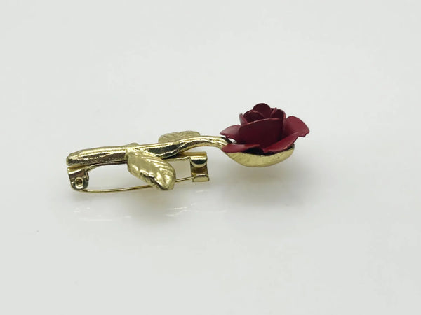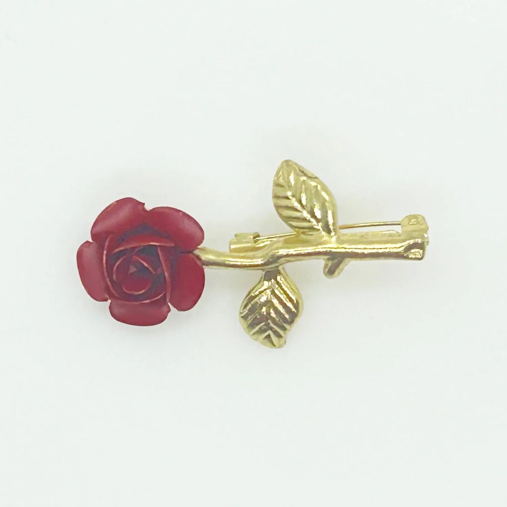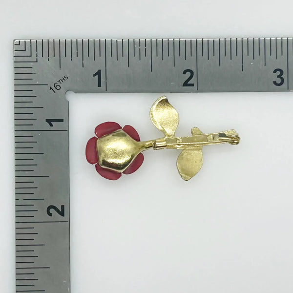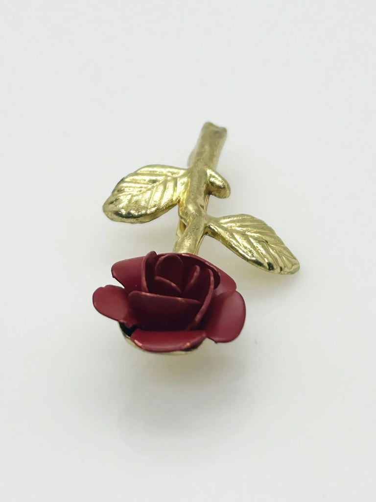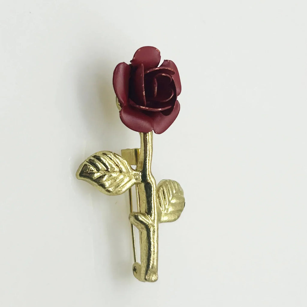 This is a beautifully crafted red rose brooch. Each petal is distinct and deep red, and the brooch measures inches tall. Indulge in sophistication and elegance with this stunningly designed red rose brooch. Every petal is meticulously crafted, showcasing its deep, rich hue. Measuring slightly over 1.5 inches tall, it's the perfect statement piece for any occasion.
