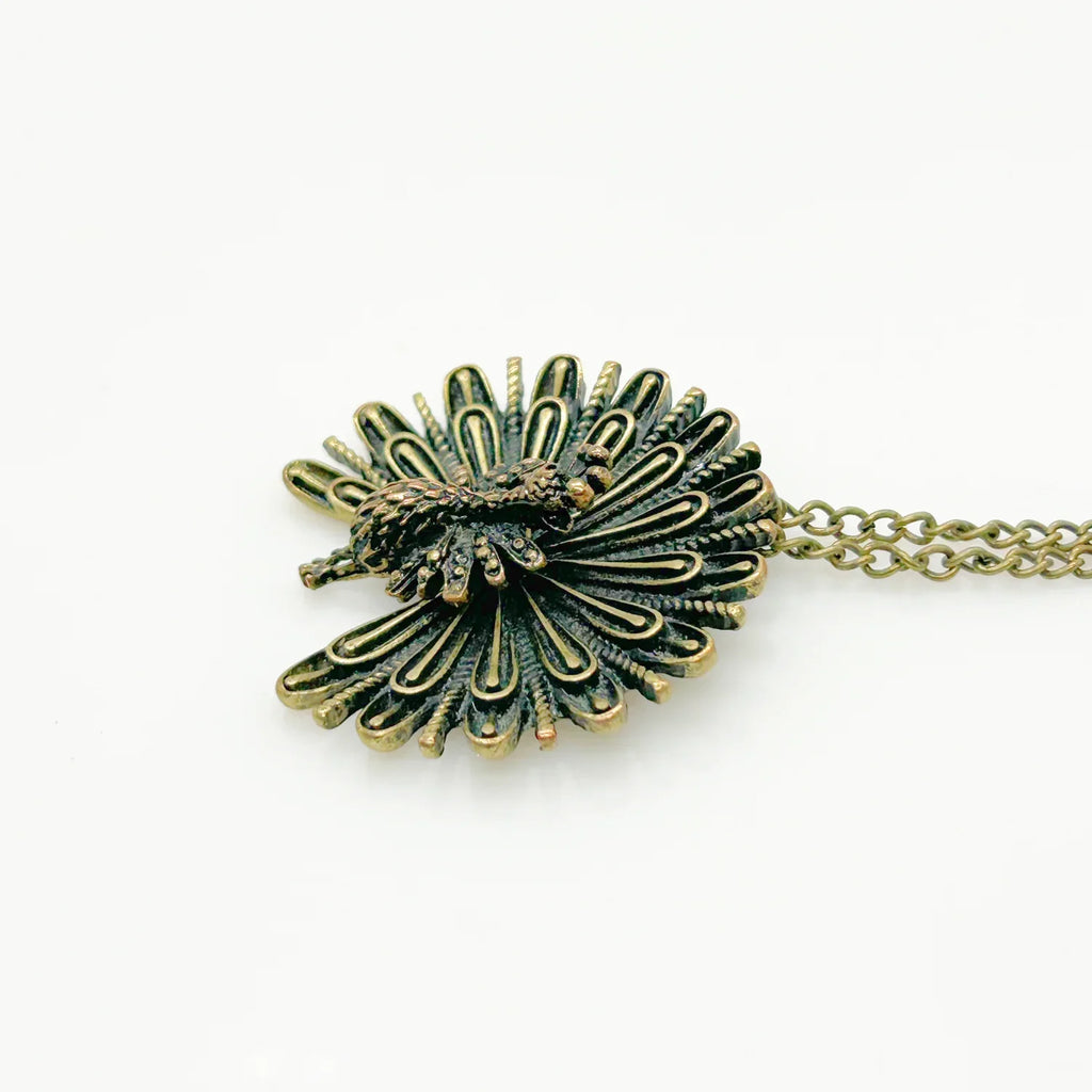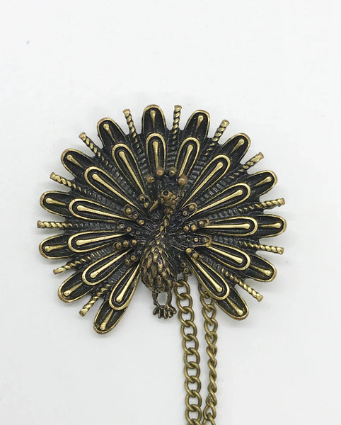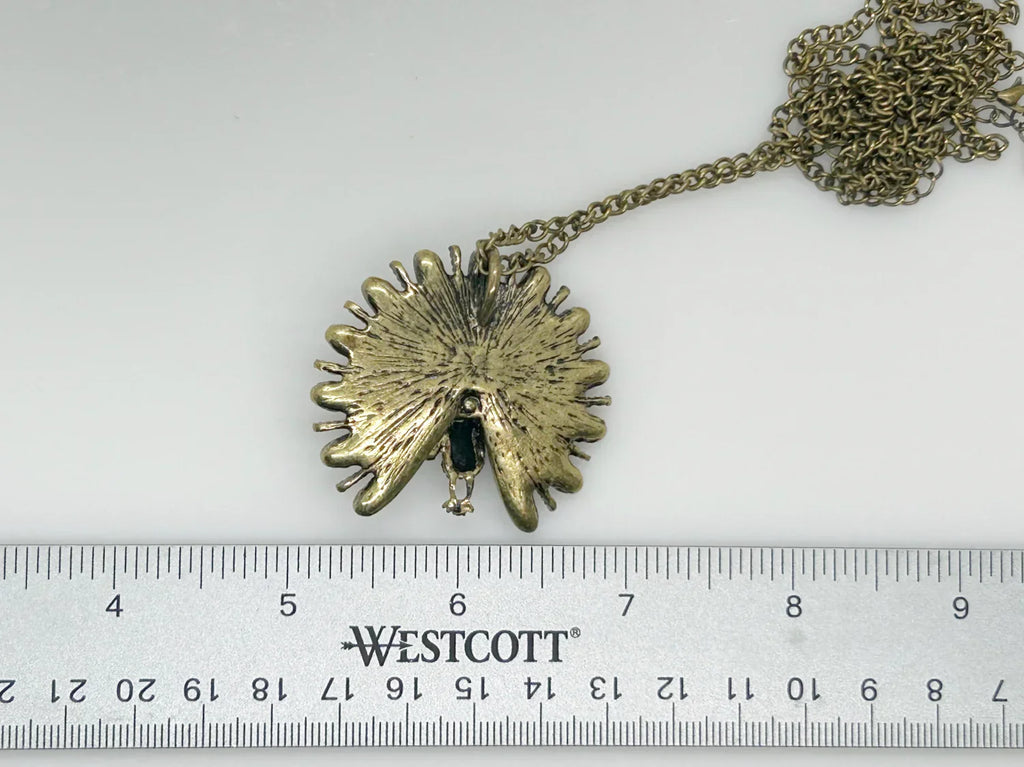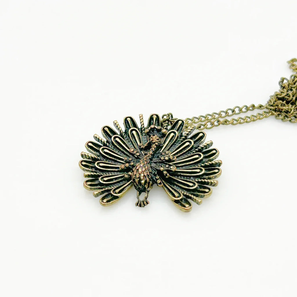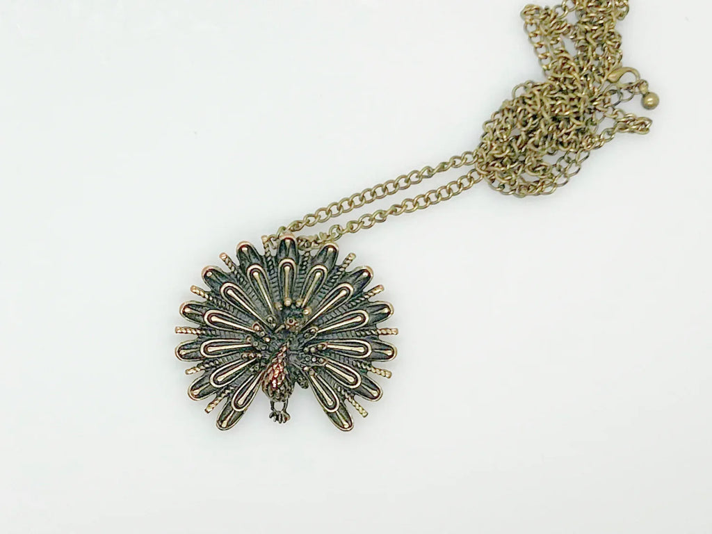 Looking for a charming vintage accessory? Look no further than this stunning peacock pendant! Measuring 1 1/2" by 1 3/4", it's sure to make a statement. Plus, it comes with a 34" chain - what a find for any vintage enthusiast!