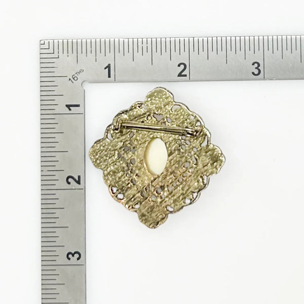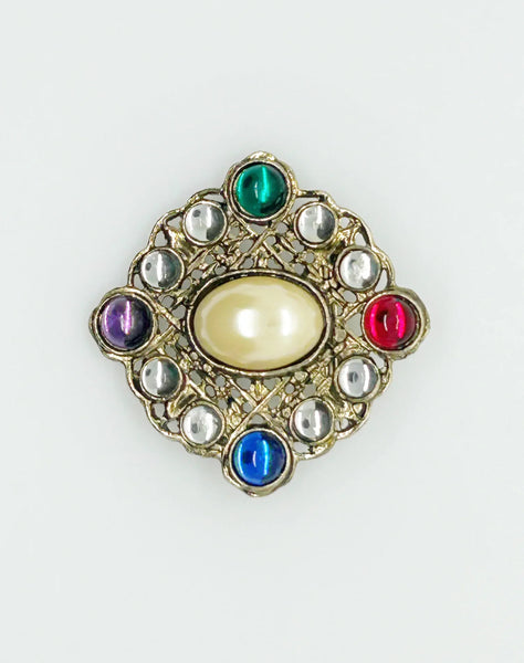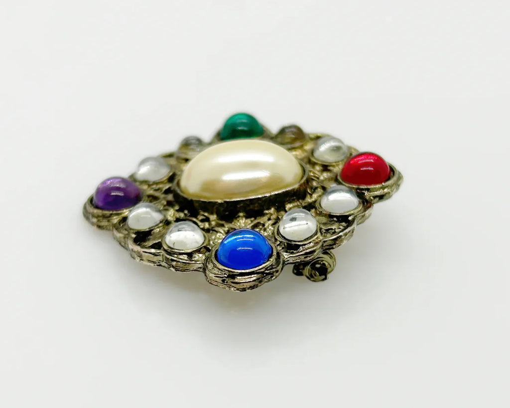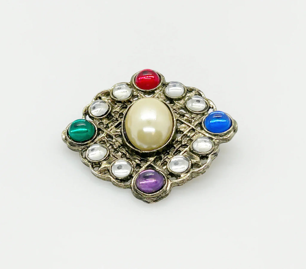 This striking brooch boasts a majestic diamond design, crafted from intricately detailed filigree metal and adorned with a sizable oval faux pearl at its heart. Surrounding the pin are lustrous round cabochons in a rich palette of red, green, purple, and blue, elegantly interspersed with two clear gems between each color. Standing at 2 inches by 2 inches, this brooch exudes opulence and sophistication.