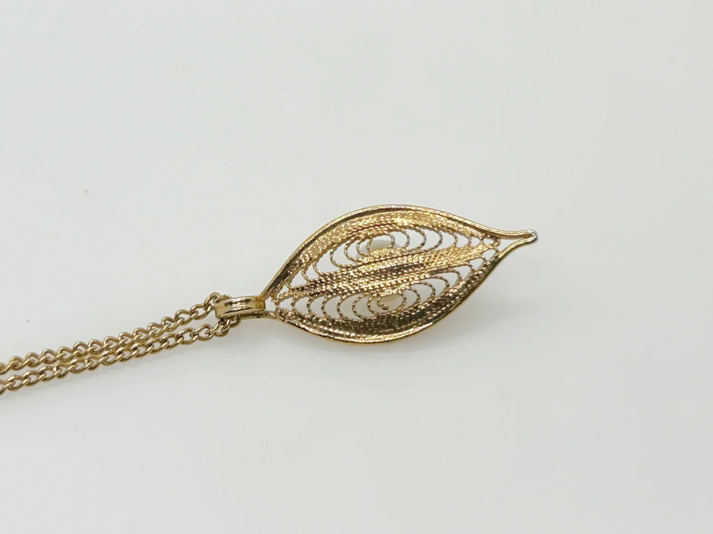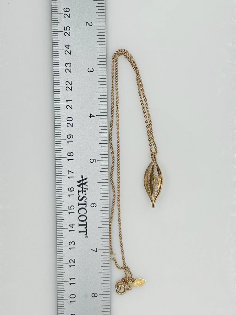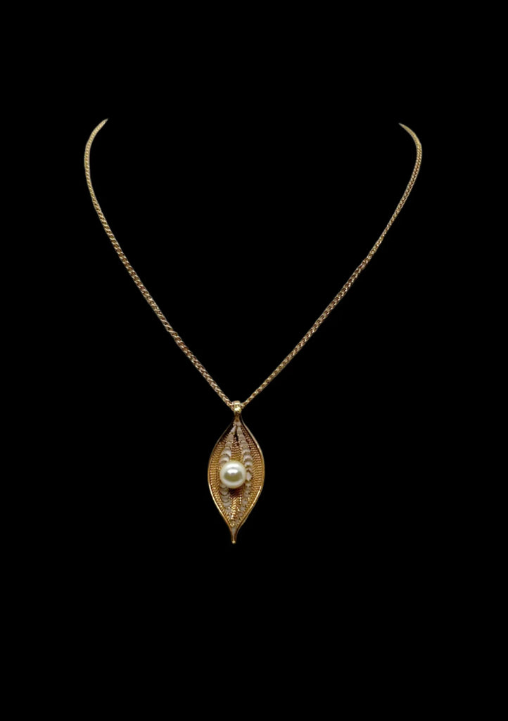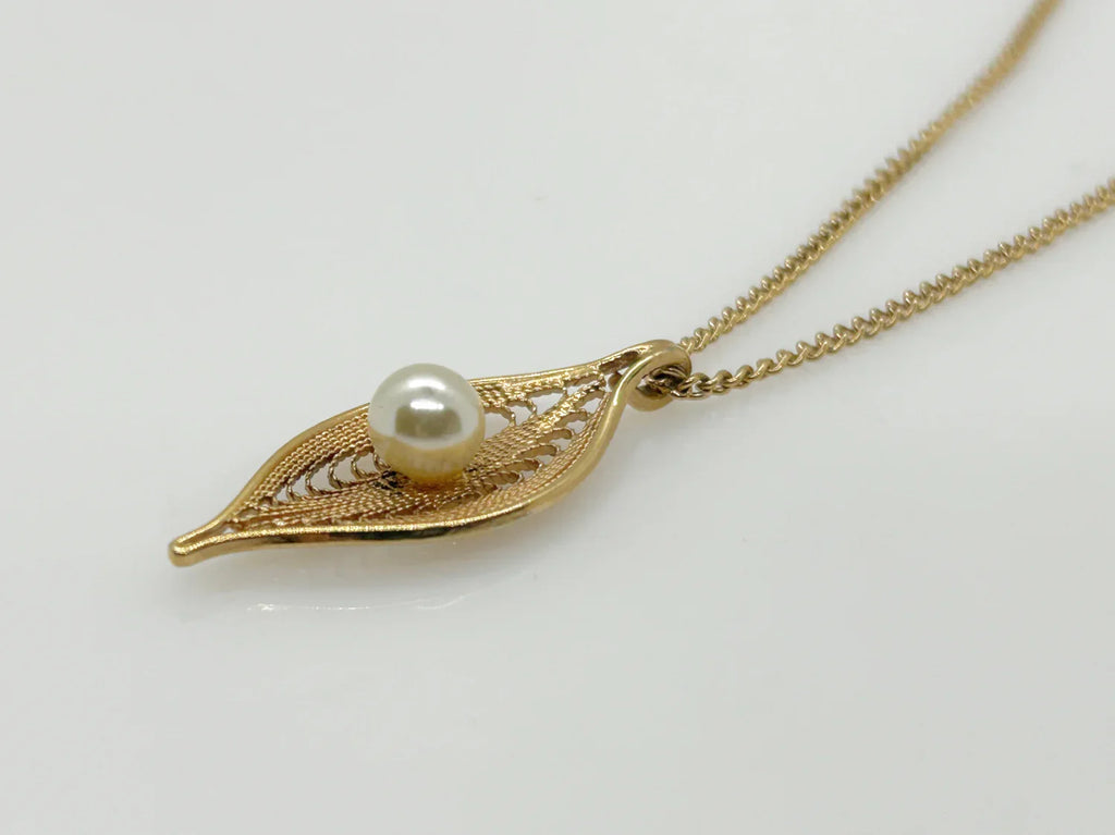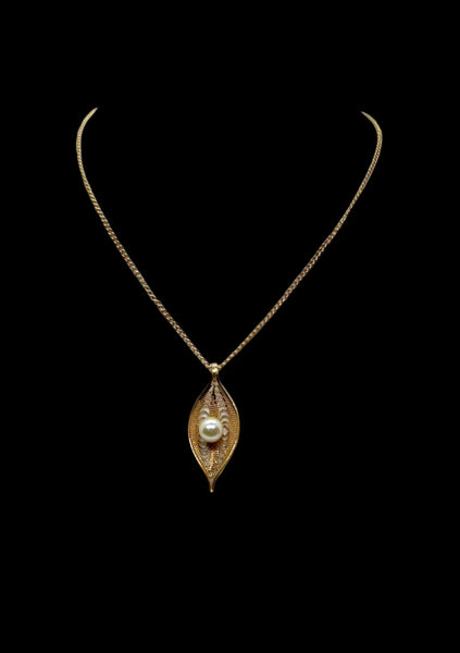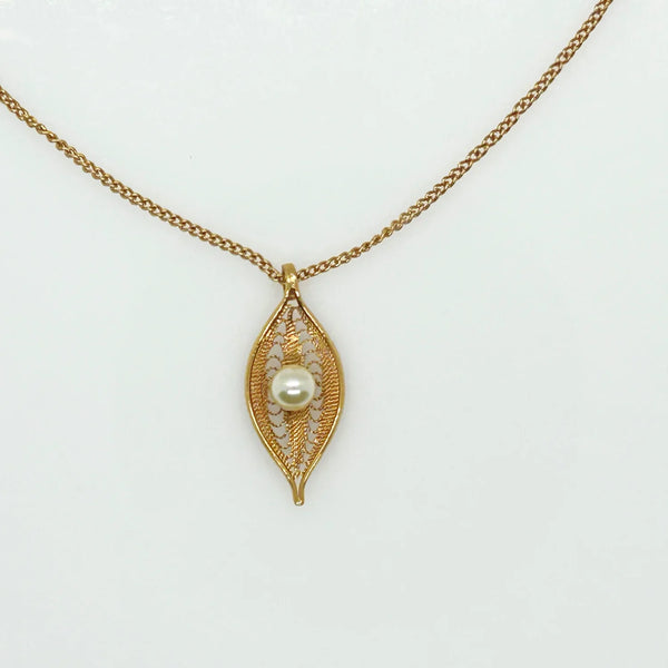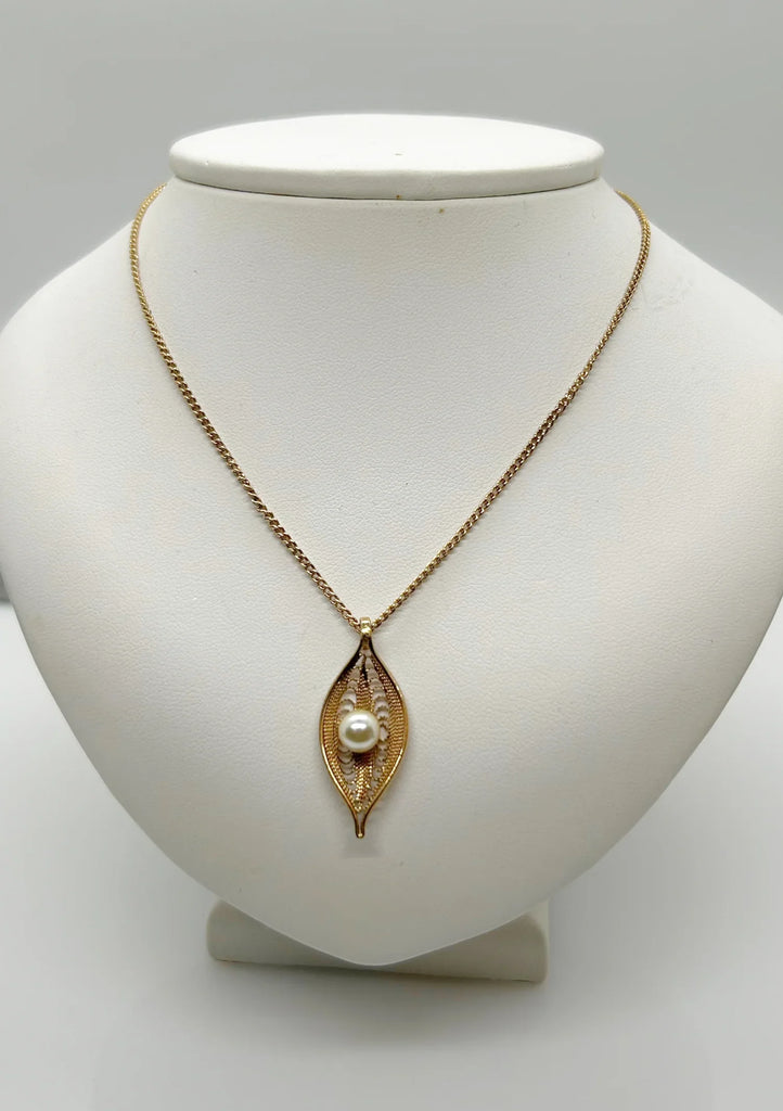 This is a classic and timeless necklace from the 1960s, made of a marquise shaped filigree pendant set with a lovely faux pearl in the center. It hangs on a delicate cian, and has a diamond shaped hang tag with "sarah cov" in all capital letters. The chain is 16" with a 2" extender, and is secured by a spring clasp.