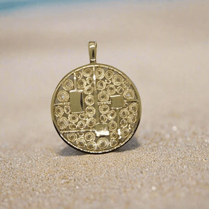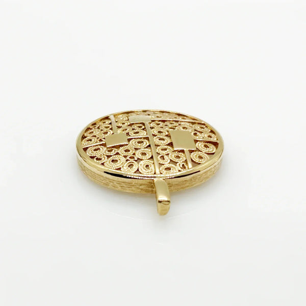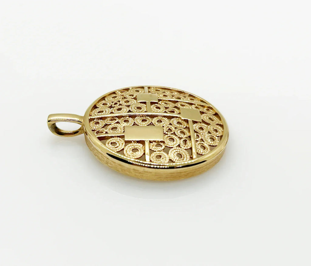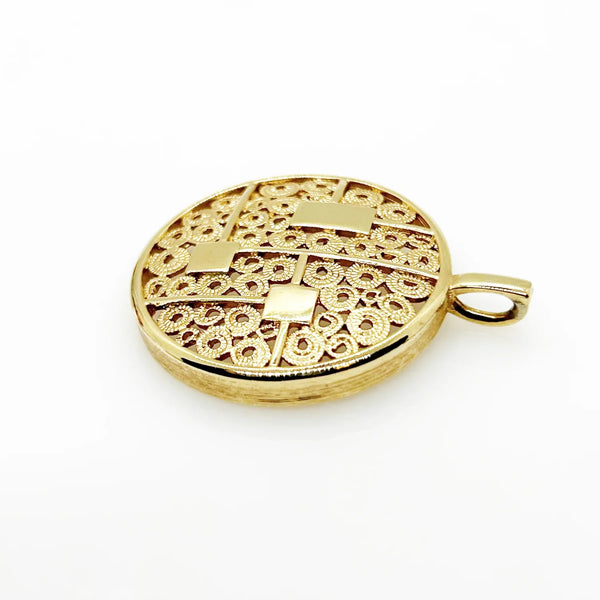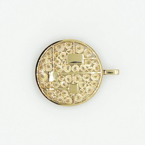 This vintage pendant has a mysterious look- with its textured field upon which shiny shapes rest. It's hard to pinpoint a particular style. It is eye catching and unusual, and measures 1.25" across. It is signed Sarah in upper case letters with the copyright symbol. Excellent condition.