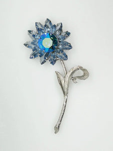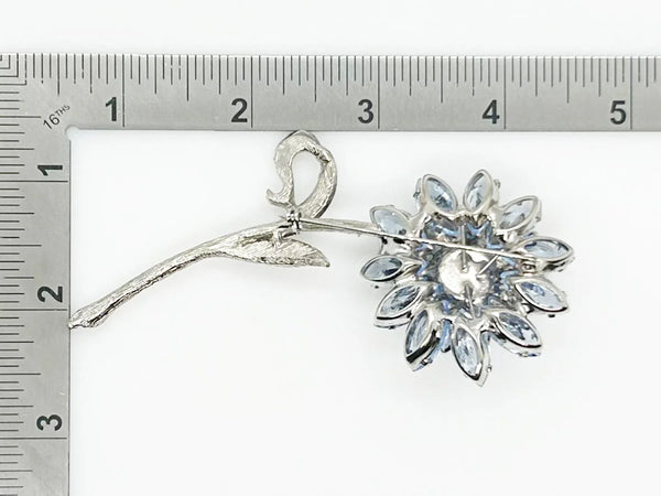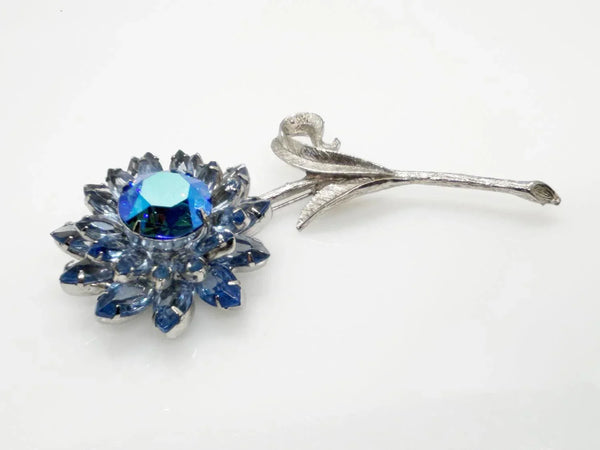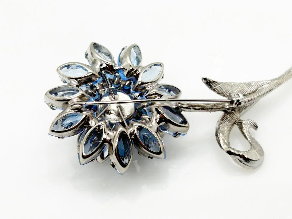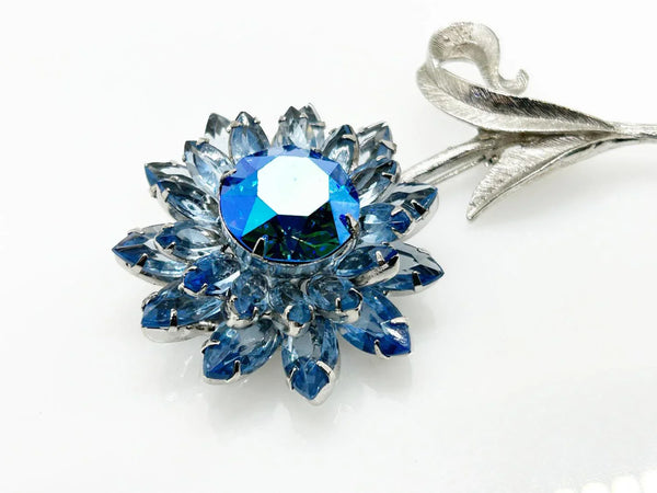Experience the sheer beauty of this stunning piece. A vintage brooch adorned with clear marquise blue stones set in brushed silver tone metal, accented by a striking round iridescent center stone. With multiple layers for a captivating effect, this exquisite brooch stands at an impressive 4" tall. Meticulously crafted with exceptional construction and attention to detail. Free Shipping