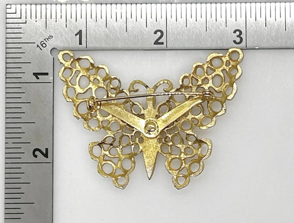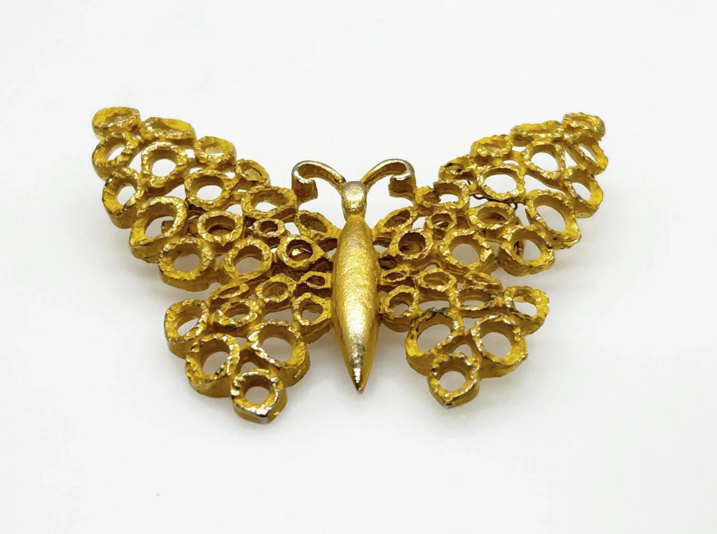 Bring some vintage charm to your wardrobe with this unique butterfly brooch! Made with textured shapes forming the wings, it adds a playful touch to any outfit. The openwork design measures 2.25" across, giving it a whimsical feel. And don't worry about a little wear and tear - it only adds to the quirky character of this brooch!