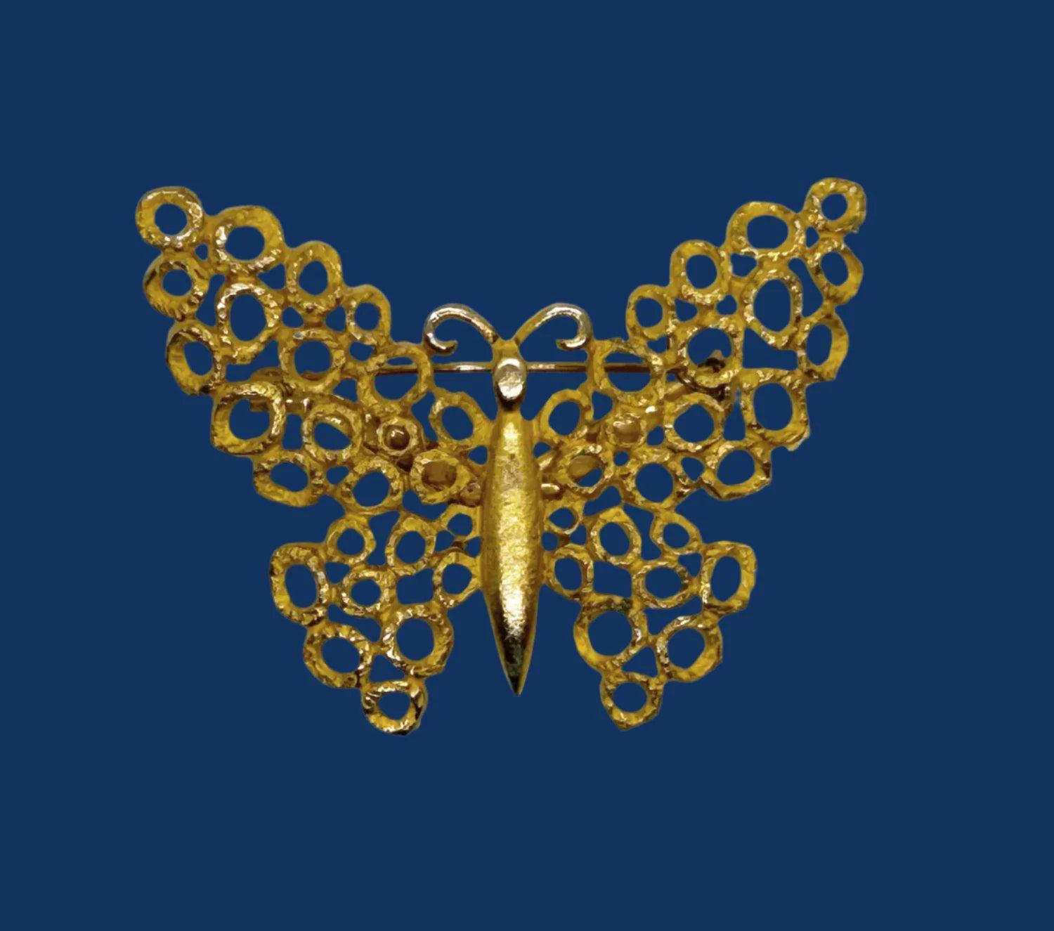 Here is an eye catching vintage butterfly brooch, made with textured shapes forming the wings. They could be bubbles, donuts, bagels, circles...however you imagine them! It is openwork and measures 2.25" across. It shows some wear but it adds to the vintage charm of the brooch.