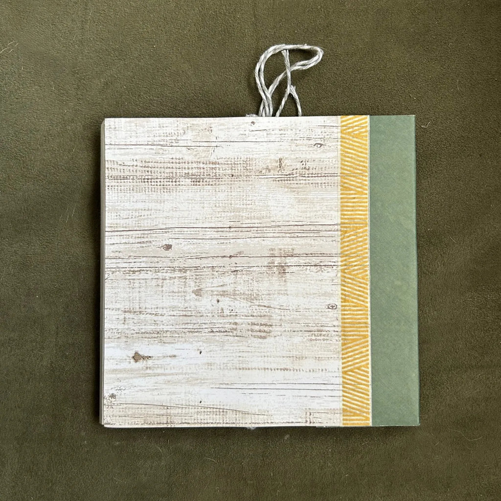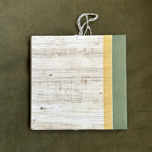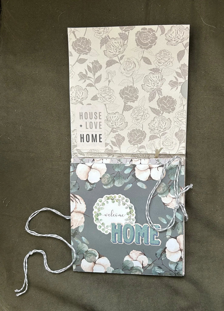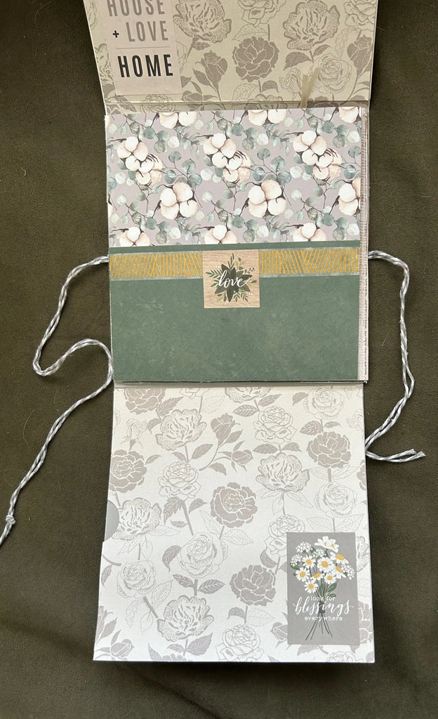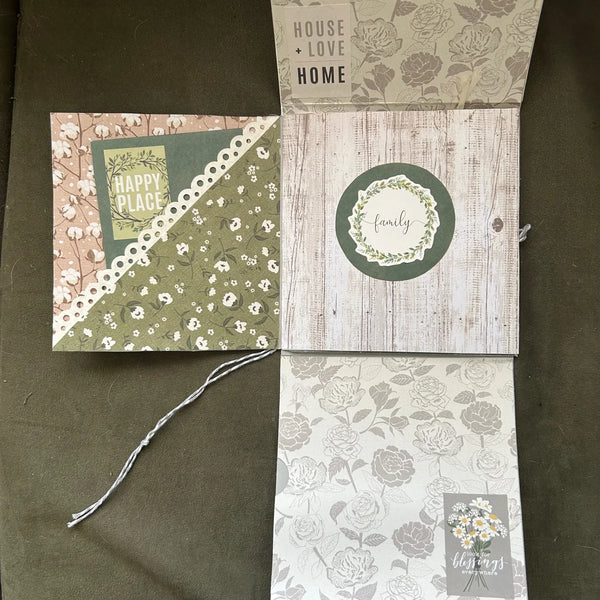 This stunning album features an olive green cover with a rustic tie. It opens at the top and has fold-outs in both vertical and horizontal orientations. The pale white and olive green tie adds a lovely touch to the overall design. Inside, there are three horizontal pages with five slots for pictures and plenty of space for notes, making it perfect for celebrating home, family, and blessings. The album measures 6x6 inches and is a wonderful addition to any collection.