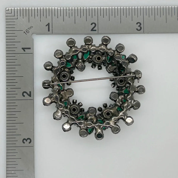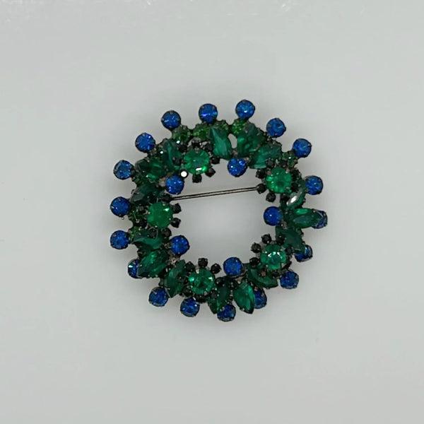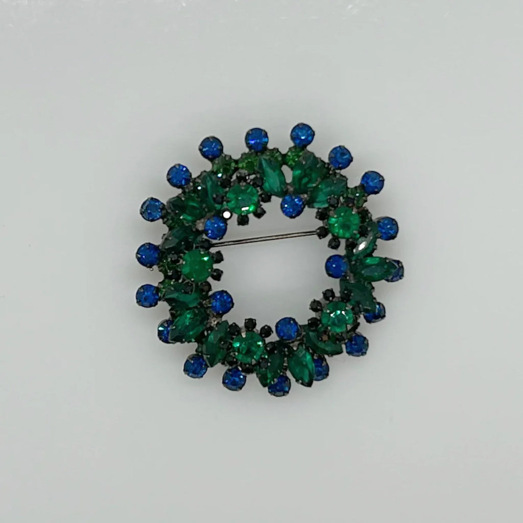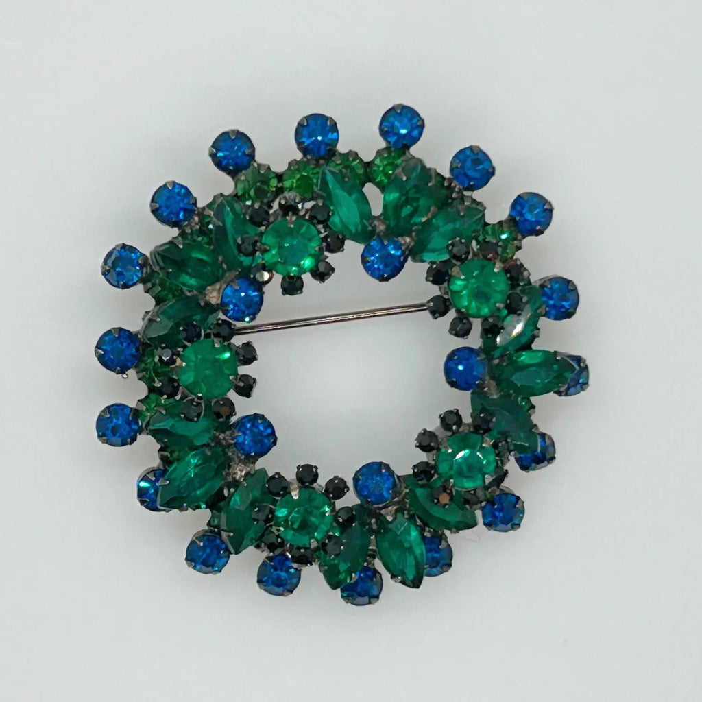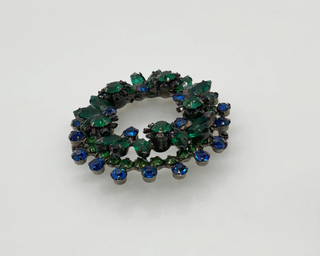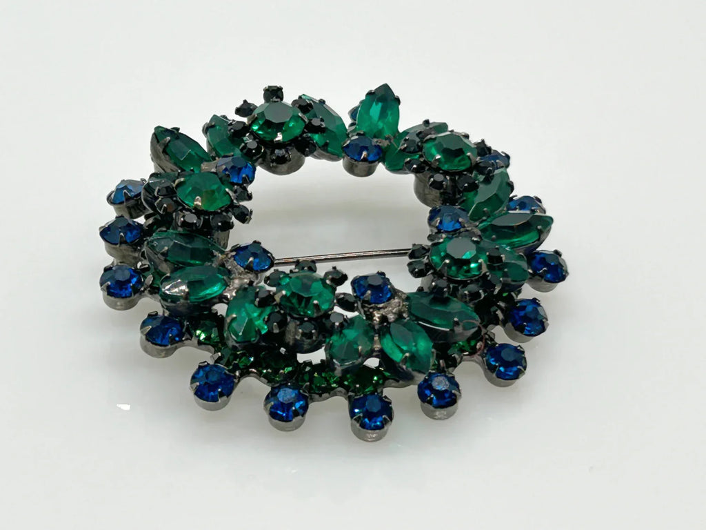 This stunning brooch features a dazzling mix of blue and green rhinestones in round and marquise cuts, all set in blackened metal for a striking layered effect. Its eye-catching design is complemented by excellent condition and the distinctive figure 8 markings on the back, suggesting it’s an unsigned Juliana piece. Measuring 2 inches wide, this unique accessory is perfect for adding vintage charm to any outfit. Enjoy Free Shipping with your purchase.