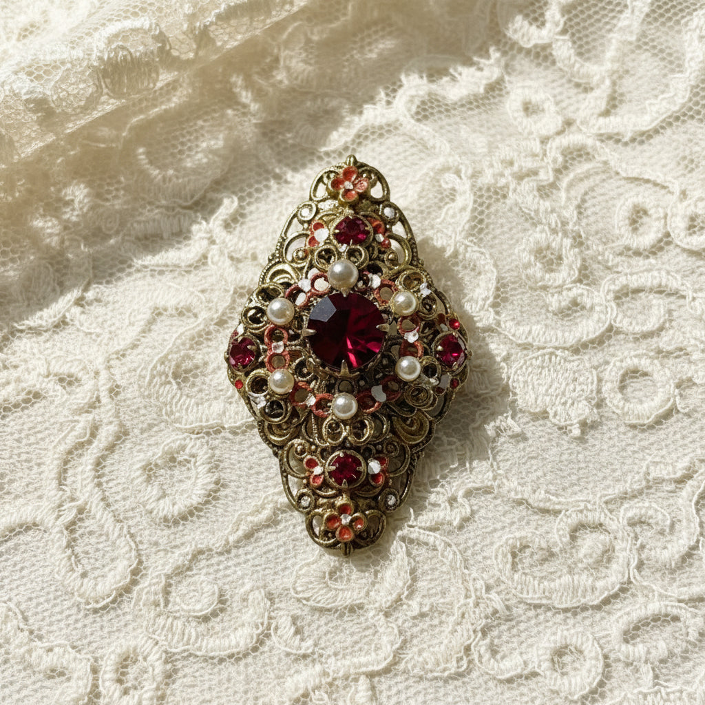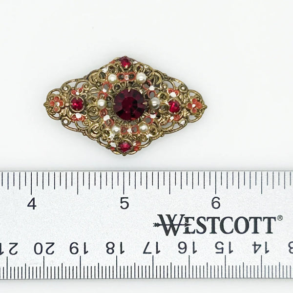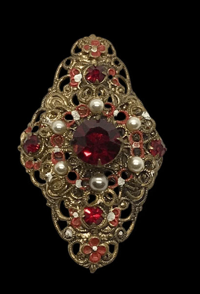 Exquisite Vintage Austrian Brooch with Filigree and Red Stones