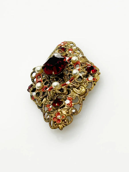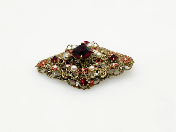 This ornate vintage Austrian brooch is composed of filigree metal and is adorned with round red rhinestones, faux pearls and red and white accents. Measuring approximately 2", the piece is in good vintage condition, and displays a MADE IN AUSTRIA hallmark. Indulge in timeless elegance with our vintage Austrian brooch. Adorned with intricate filigree metal and sparkling round red stones, it exudes sophistication. The perfect addition to your jewelry collection, it boasts a MADE IN AUSTRIA hallmark.