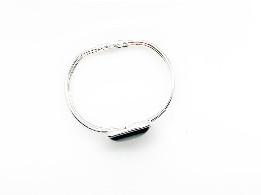 The polished silver setting is meticulously crafted to highlight the black square onyx stone’s deep, rich color. Each band is perfectly aligned, contributing to a streamlined look that marries vintage charm with modern wearability. The onyx's bezel setting ensures protection against damage, maintaining its glossy surface throughout years of use. The silver metal maintains its shine and structural integrity, affirming the high-quality materials used in this finely crafted bracelet.